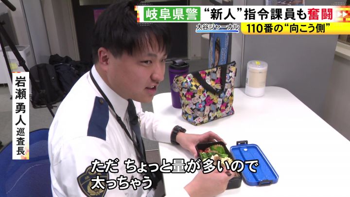指令室での勤務は、午前8時半からの24時間。奥さんが作った弁当で昼食をとるが、それも指令室の中だ。 2024年に結婚したばかりの岩瀬巡査長。「毎日色んなパターンで作ってくれるのでありがたい。ただ、量が多いので太っちゃう」と“おのろけ”気味だ。春には、第一子の誕生も控えている。