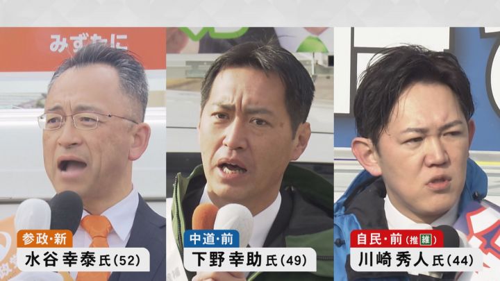 参政・新 水谷幸泰氏: 「赤字でも課税をされる、納めなければいけない消費税を廃止することで、お手元に税金を残す。われわれ参政党は、国民の利益一人一人、そして幸せを願い、私たち同じ国民の目線で政治を訴える、日本国を立て直す」 中道・前 下野幸助氏: 「しっかりと自民党とは違う、今回は中道改革連合、中道改革連合で政治改革も推し進めていかなければなりません。何ら裏金議員に対する施策も変わっておりません。政治改革の前進ができるように取り組んでまいります」 自民・前(推=維)川崎秀人氏: 「我々がやりたいこと、それはすなわち日本を守ることです。積極的に守っていくことこそ、この日本の経済成長になると信じています。例えば、食料安全保障、わが国でしっかりと自分たちの胃袋が満たせるように。積極的に政府が投資を行っていく」