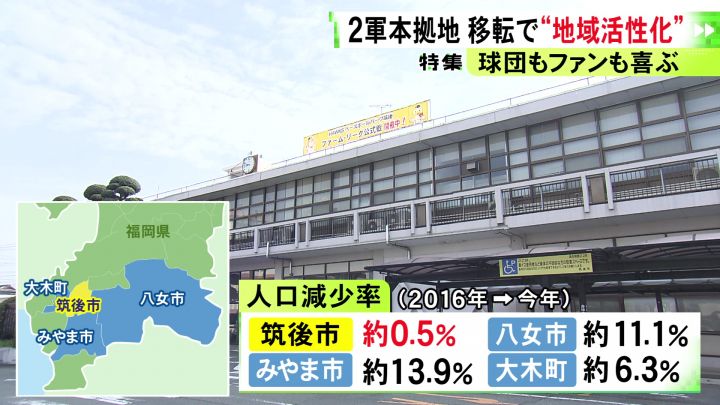筑後市の市長も、知名度アップに2軍本拠地の存在は大きいと感じている。 西田正治筑後市長: 「『筑後市は福岡県のどの位置にありますか?』というようなことが多かった。2軍本拠地ができて、「ホークスの2軍本拠地がある筑後市です」と。かなり知名度が上がった。その効果が1番大きいと思います」 実際、筑後市は誘致前からの人口減少率が0.5%と、周辺の自治体に比べて圧倒的に低く、“ホークス効果”が伺える。