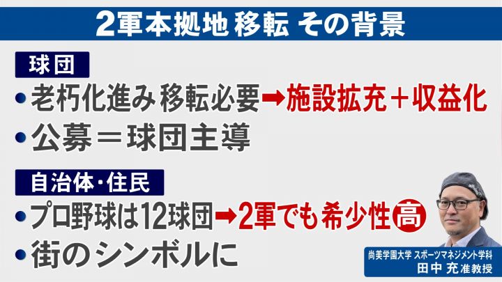 更に日本ハムは、千葉県内にある2軍本拠地を1軍と同じ北海道内に移転させる方針で、道内の3都市に絞り検討を進めているということだ。 球場移転などを研究・分析する尚美学園大学のスポーツマネジメント学科・田中充准教授に、2軍の本拠地移転の背景について話を聞いた。 田中准教授によると、球団にとっては、老朽化が進んで移転場所の確保が必要で、さらに収益化が求められる中で公募することで、球団主導で建設ができるメリットがある、としている。