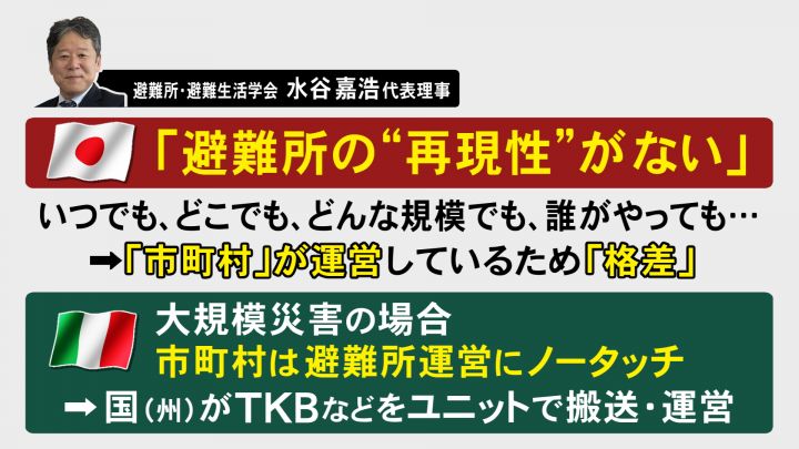一方で、イタリアは大規模災害の場合、市町村は避難所にノータッチで、国や州がTKBを備えている拠点からユニットごと運んで、設置・運営するということです。 水谷さんは、日本がこうした態勢を組むためには、災害に関する法律を根本的に変える必要があるとしています。