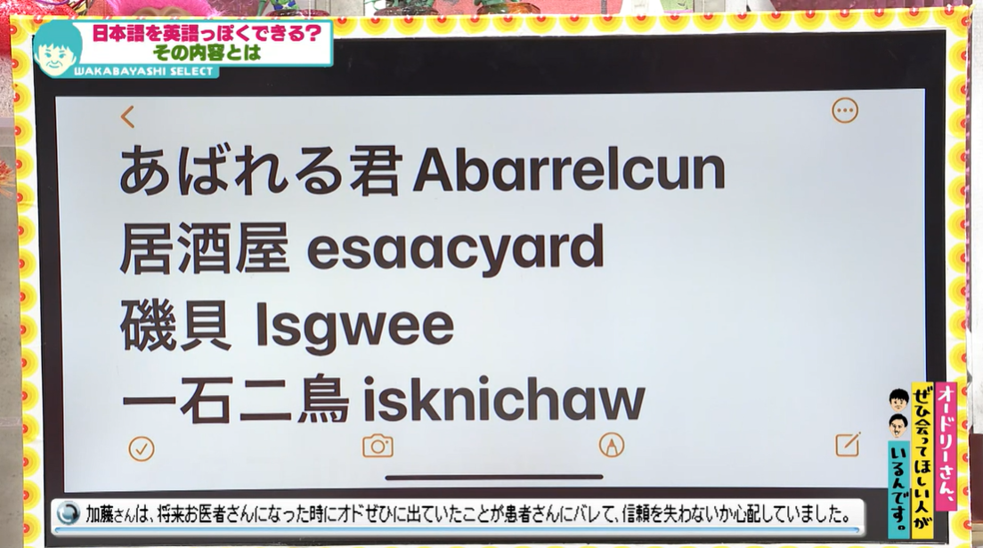 日常的に英語っぽく聞こえる発音を自分で考え、その単語をスマホに書き溜めているという加藤さん。思わず若林も、「超ヤバイやつじゃん!」とツッコミを入れてしまう一幕も。