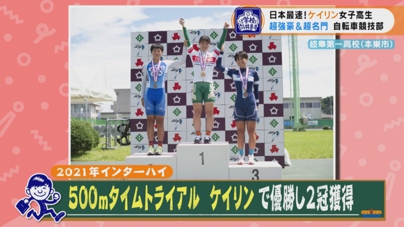 これらの種目で、何度も全国大会で優勝経験のある強豪校なのです。 向井くんは部室を訪ね、トラックレースの最速女子とご対面。6歳から自転車競技を始めて、全国大会には中学2年生から毎年出場。高校生になってから3年生の現在までに10回も優勝をしているという実力です。まさに女子ケイリン界のニュースターなのです。