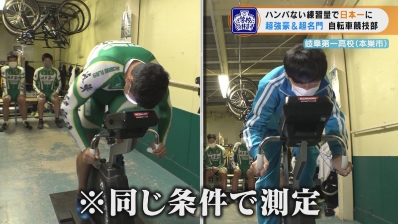 その凄さを知るためエアロバイクを使って測定すると、高速でペダルを踏み続けていく生徒。かたや向井くんも同じ負荷のかかったペダルを踏んでいきますが全くスムーズに回せず、エアロバイクから倒れ込みます。