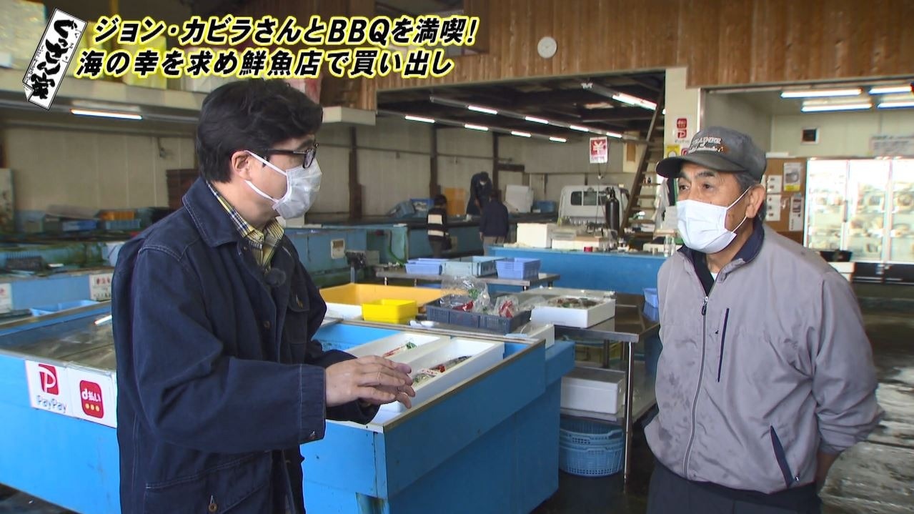まずはBBQ食材を求め、Jeepに乗り込みます。「知多半島は海の食材は何でもあって魚種が豊富なんです」と語るぐっさん。やってきたのは南知多町で50年続く『赤羽商店』。三河湾や伊勢湾から揚がる新鮮な魚介が揃う老舗の鮮魚店です。