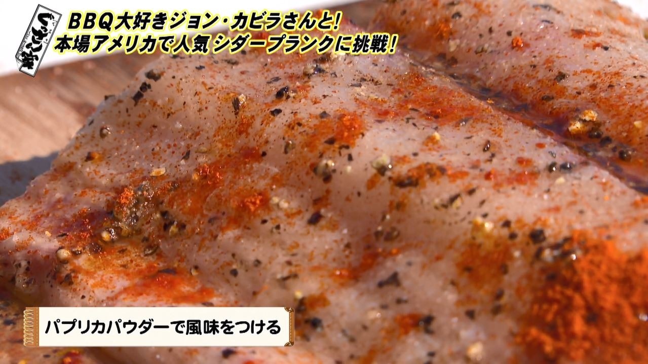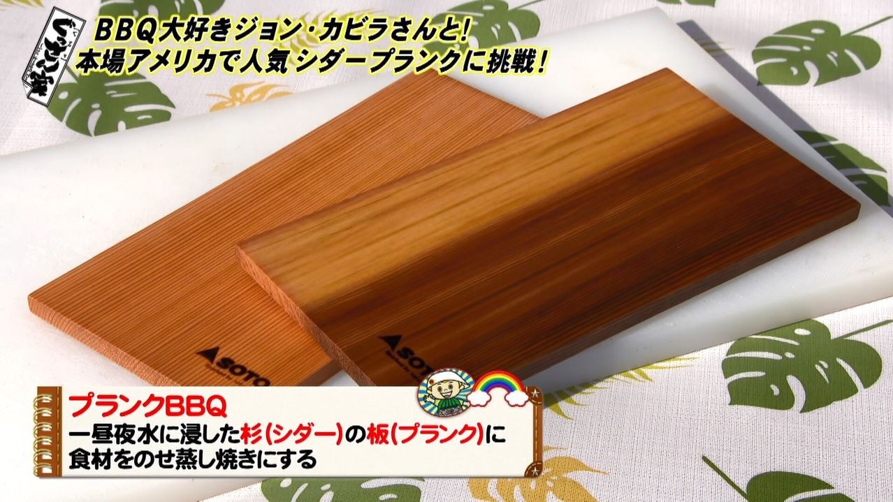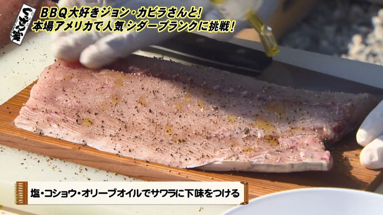 まず取り出したのは一昼夜水に浸しておいた杉の板。『シダープランク』といい、この板の上に食材をのせて、BBQグリルで板ごと蒸し焼きにするということで…「これが『プランクBBQ』なんです!」と熱く解説するジョンさん。