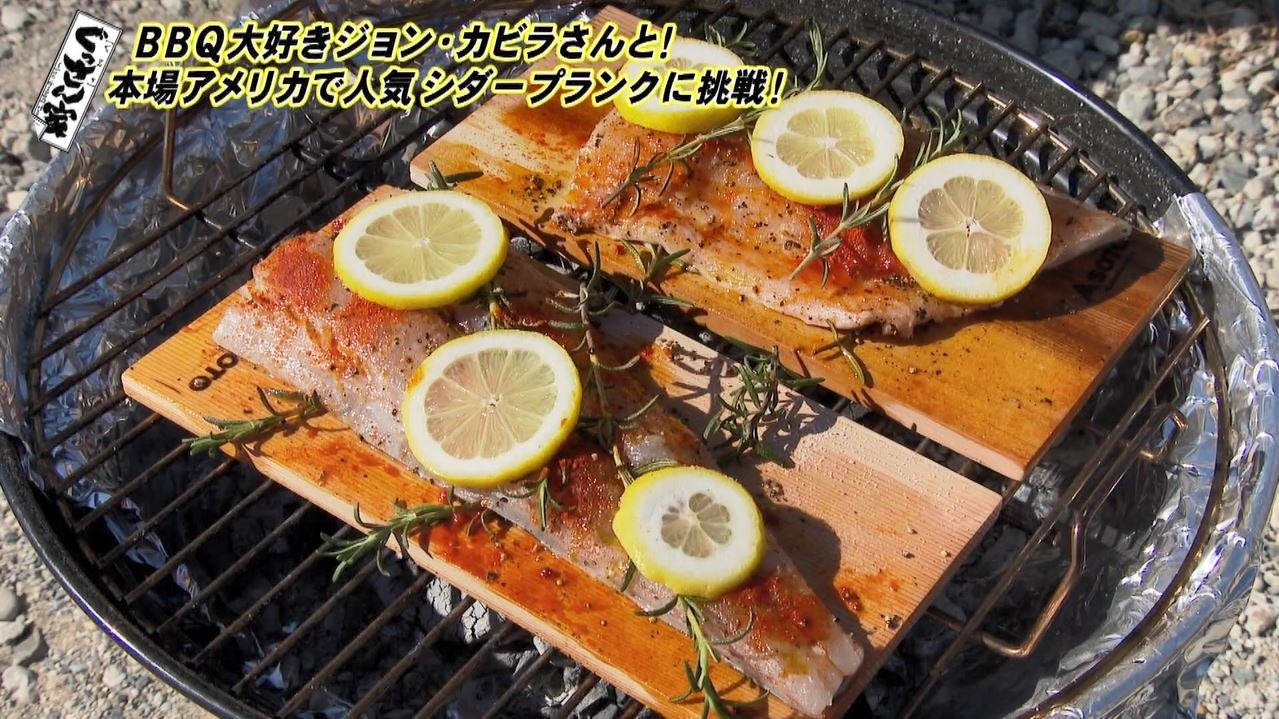 さらにレモンとローズマリーを添えて、板ごとグリルにのせて30分、フタをして蒸し焼きにします。食材に直接火があたらずジューシーに、ほのかな杉の香りも移り、風味豊かに仕上がるそうで、グリルの上に置くと、たちまち木の香りが!ぐっさんも「わっ!すっごいいい香り!」と期待が高まります。