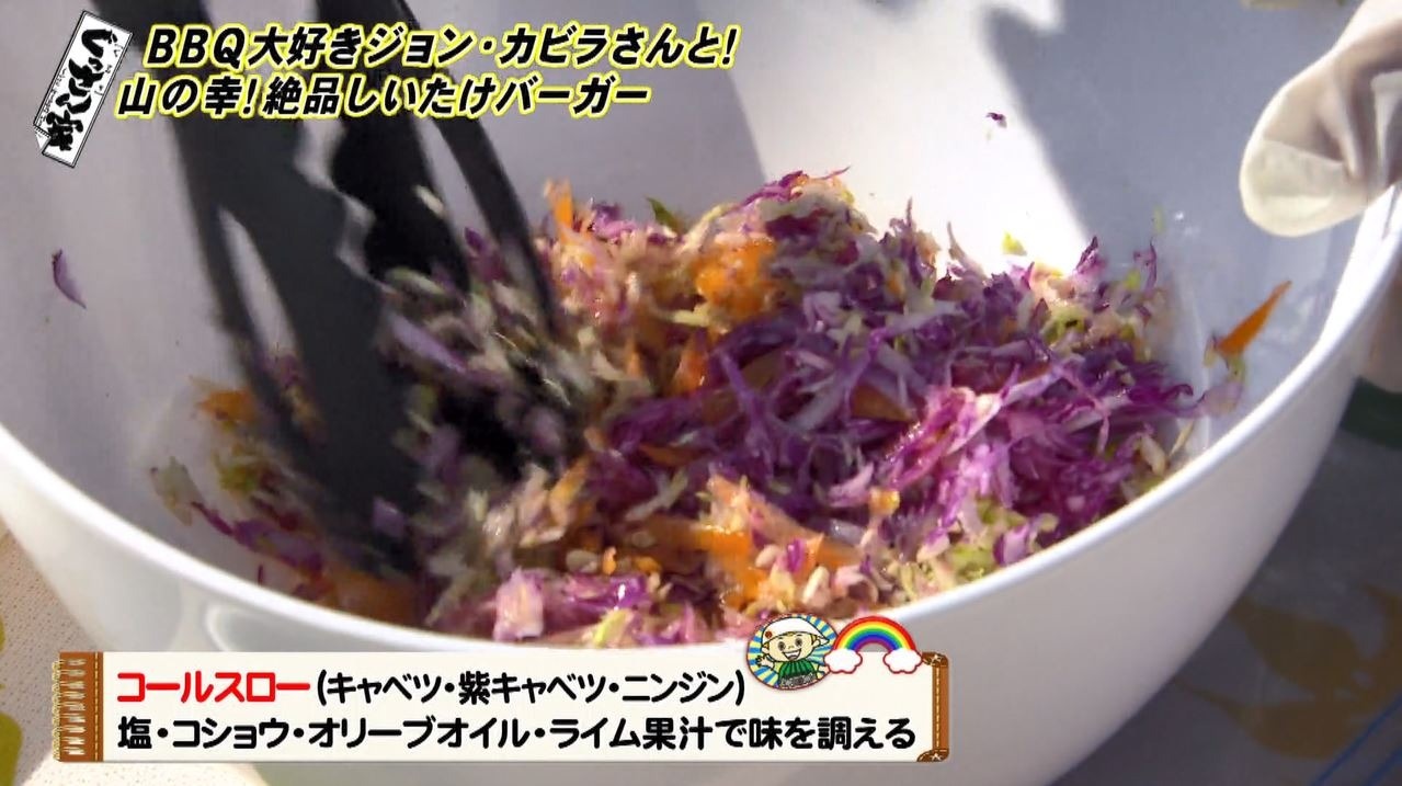 さらにキャベツ・紫キャベツ・ニンジンを使ったカラフルなコールスローと一緒にバンズに挟めば『しいたけバーガー』の完成!