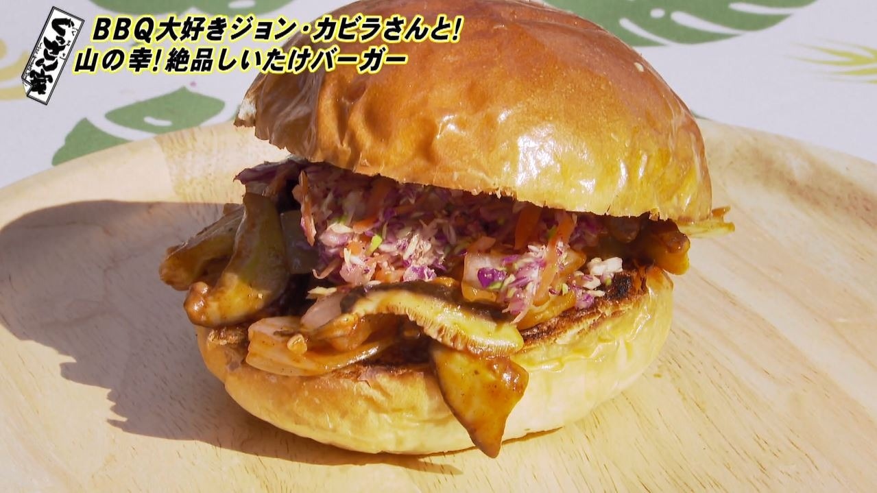 お次は『しいたけバーガー』をガブリ!「うーまい!甘味と酸味がちょうどいいっすねー。これ、どっかやりますよ。大手が。知多バーガーでね。」とあまりの美味しさに商品化を提案するぐっさん。するとジョンさんも「やって欲しいです。JA知多の皆さん、アナザー名物!?」と『しいたけバーガー』をアピール!