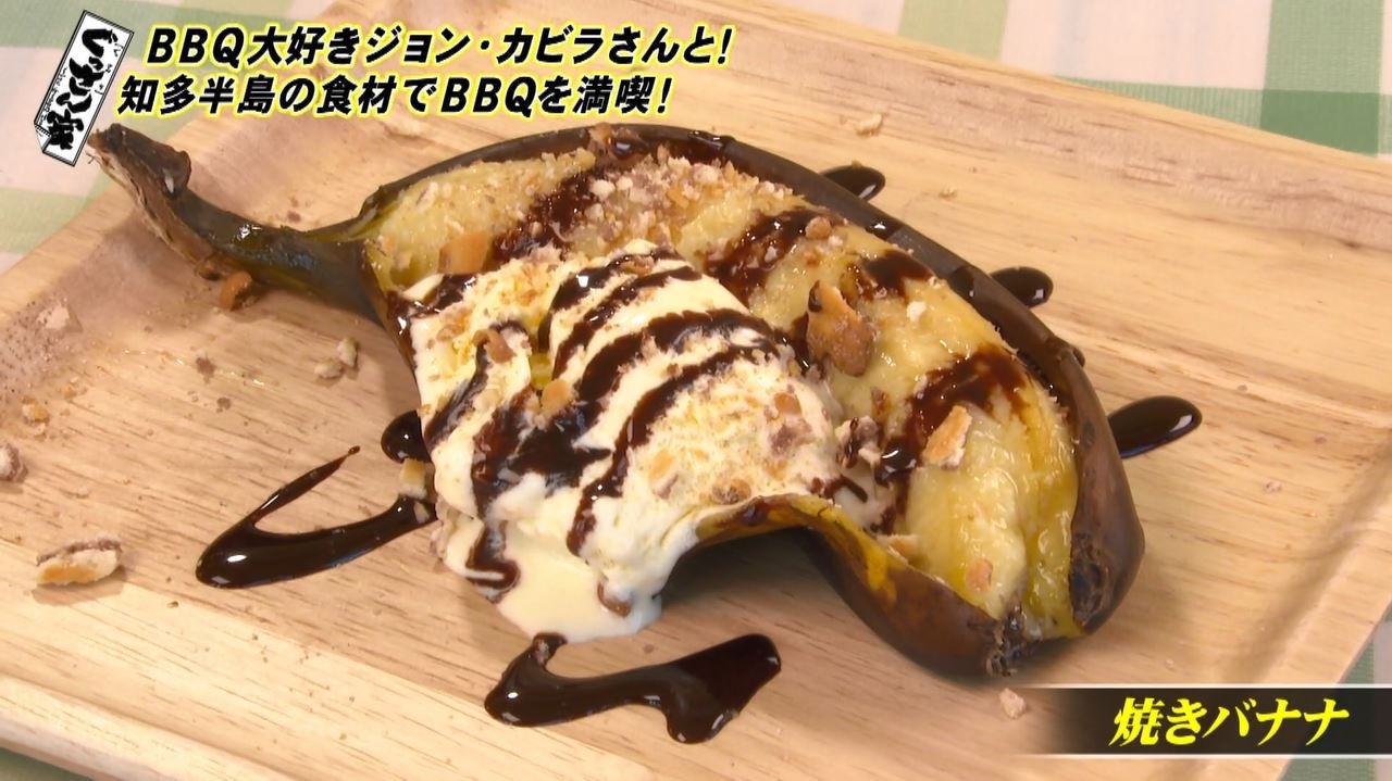 熱々の焼きバナナにバニラアイス・砕いたしるこサンド・チョコレートソースを添えておしゃれなBBQデザートの完成!