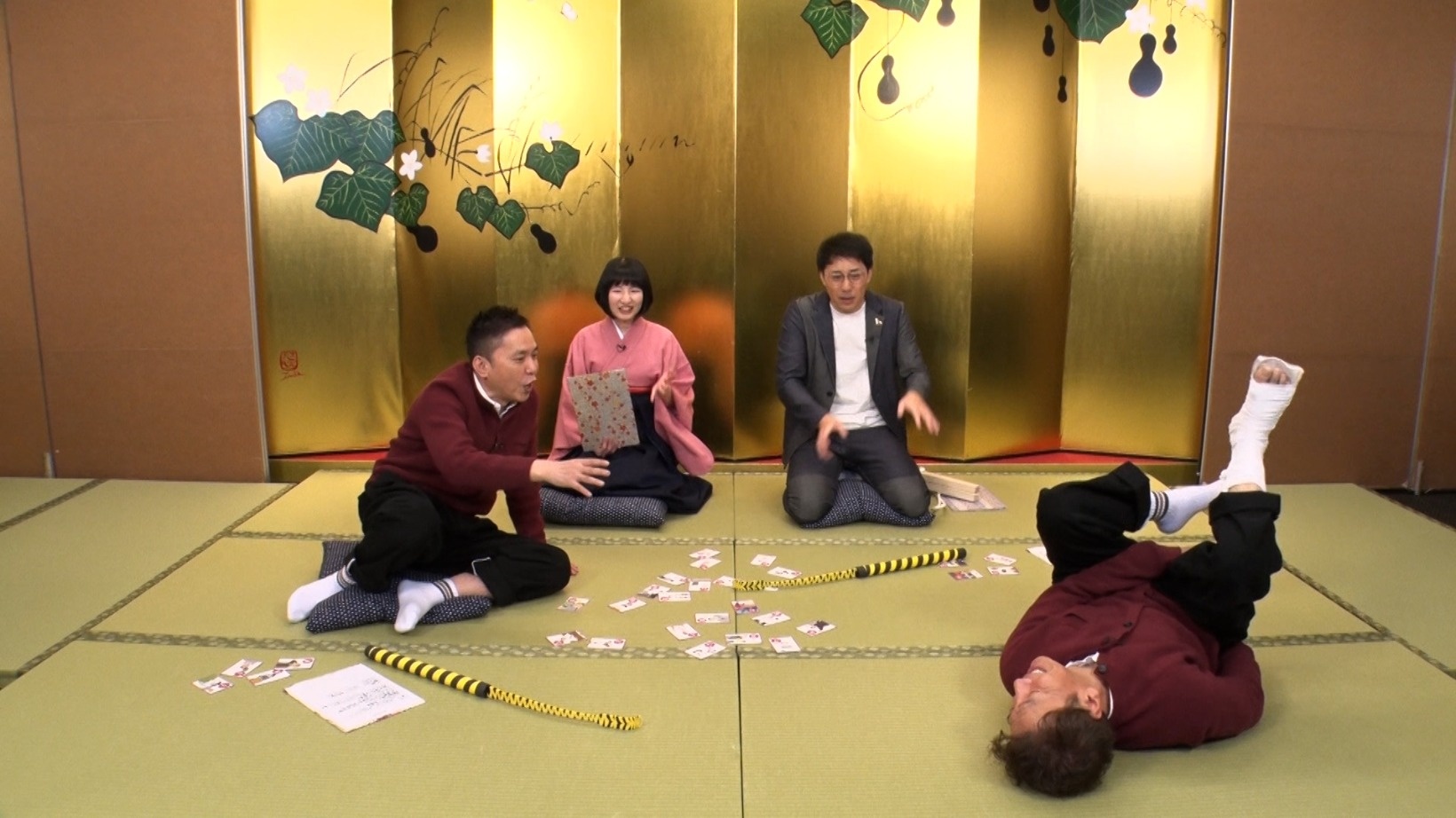 太田上田によるカルタ対決は、4対4の大接戦の展開に。骨折中の上田は気合いを入れようと椅子から下りるが、ここで足がつってしまうアクシデントが発生した。