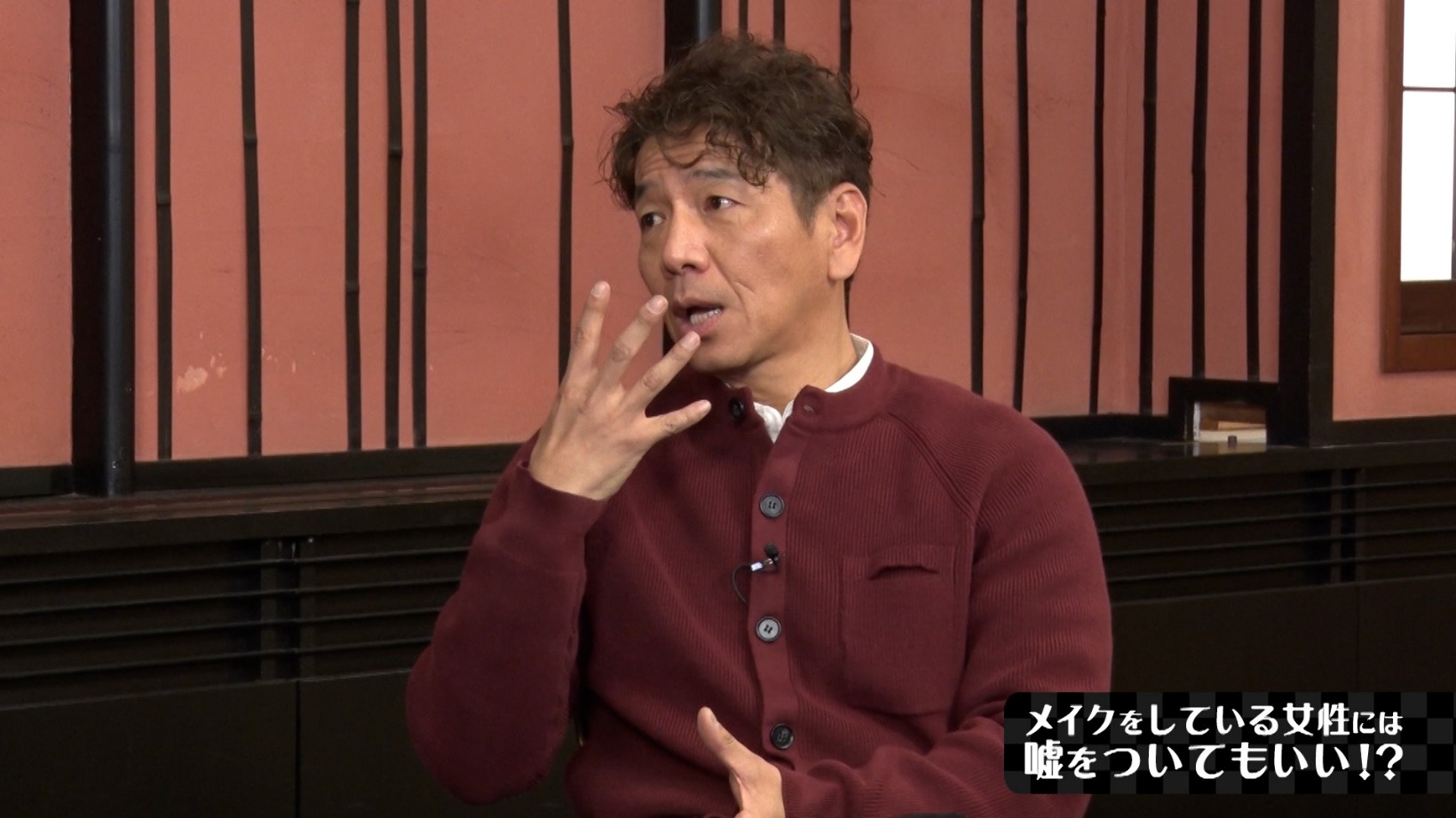 「メイクをしている女性には嘘をついてもいい」という不思議な理論を唱える上田。メイクをすることで「相手の目を騙している」と主張し、こちらも嘘をつくことで五分五分になるという考えのようだ。