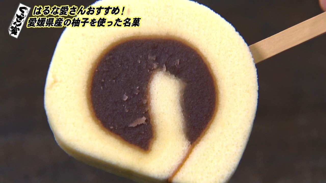 ふっくらと焼き上げたスポンジ生地に、愛媛県産の柚子を混ぜたこし餡を“の”の字になるようやさしく巻いています。モニター越しですが2人一緒にいただきます。「あー美味しい!甘味と酸味と、ちょっとほろ苦さもあるでしょ」と堪能するぐっさん。「やばーい!これほんまに思い出す」と愛さんも感激!