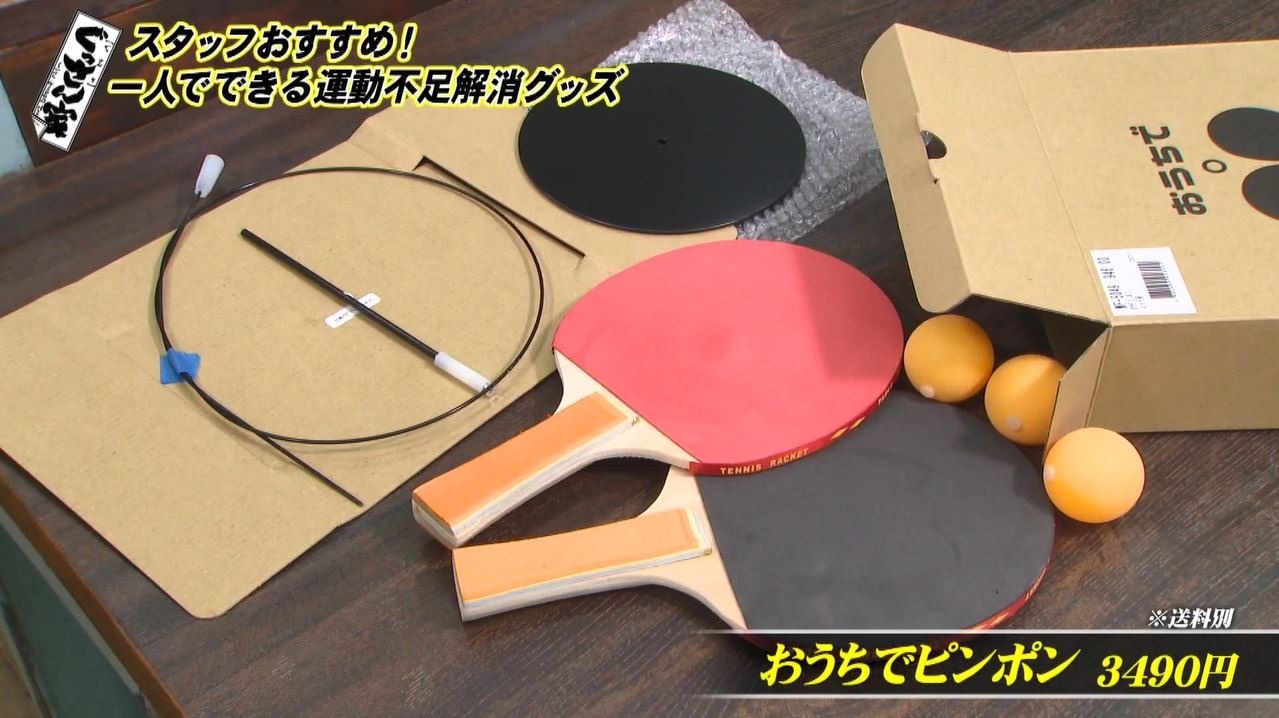 「ぐっさん 年末年始は沢山おいしいものを食べたと思います。体のことを考えて気軽にできるエクササイズグッズを見つけました。お家にいながらひとりで楽しくピンポンしちゃってください」とのメッセージ。そして箱から出てきたのは『おうちでピンポン』という商品。ぐっさんも「え?ひとりで!?ひとりでできるやつ?」と興味津々です。
