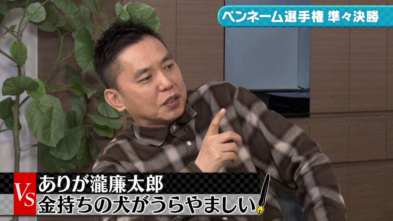 1戦目は「ありが瀧廉太郎」vs「金持ちの犬が羨ましい」。上田は、「『ありが瀧廉太郎』もいいなあ。伸びてきたな。『なにを1.5リットル』みたいな」と自作のペンネームを交えて評価した。