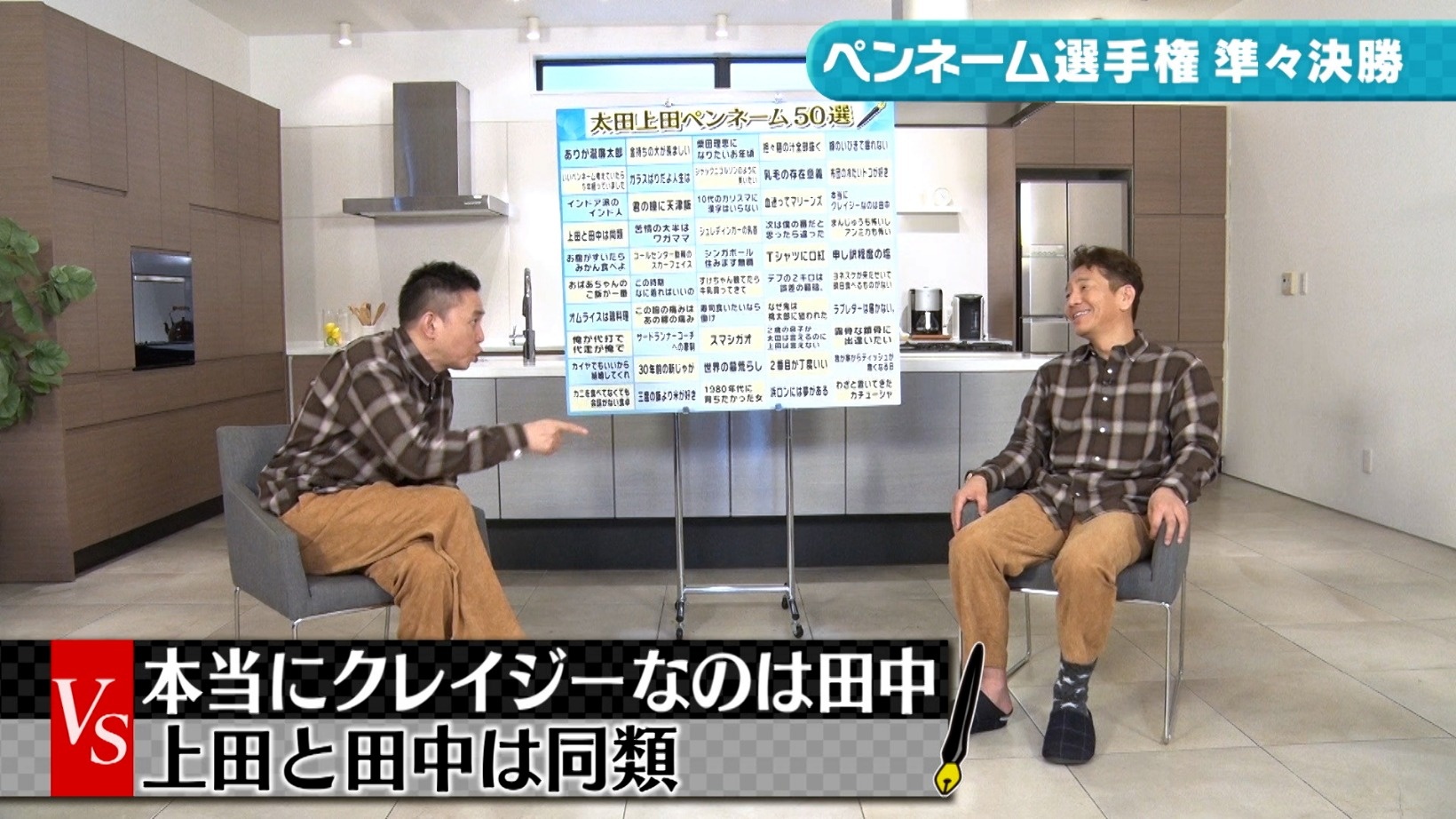 すっかり論破されてしまった上田は、「田中さんのことは人間としてもリスペクトしてるし、芸人としてもすごい好き。好きだけど嫌だ!」と言い放ち、スタジオは大爆笑!上田の願いもむなしく、「上田と田中は同類」が勝ち進むのであった。