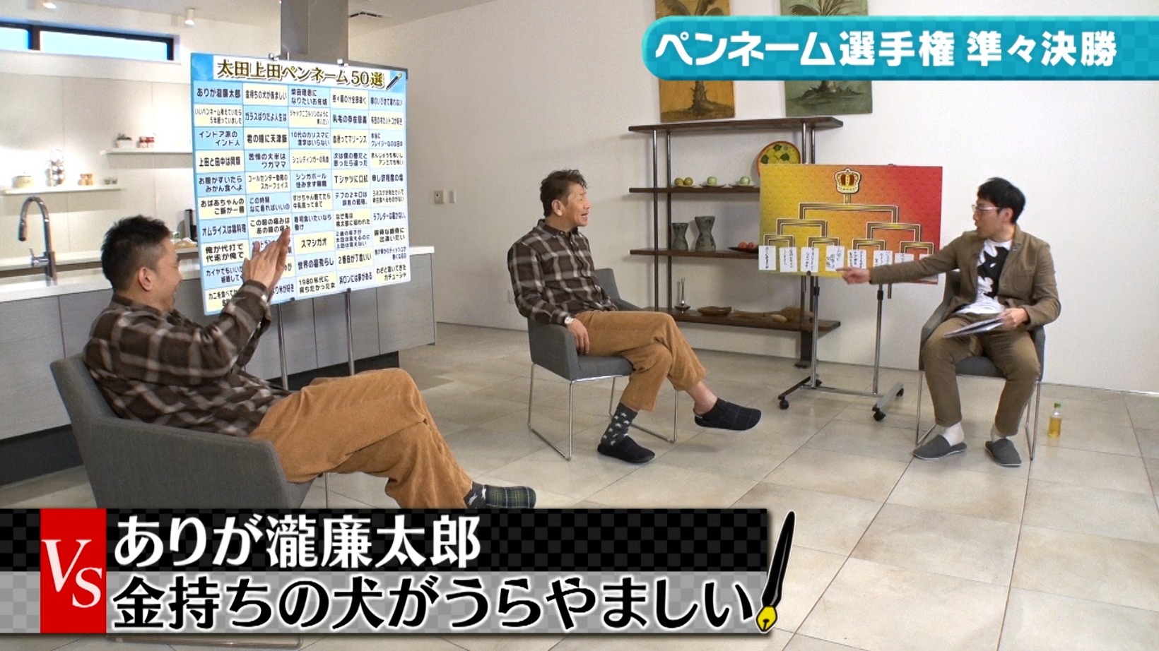 「ありが瀧廉太郎」を推す上田に対し、太田は「『金持ちの犬』って言葉自体が、なかなか出せない言葉ですよ」と評価。2人のトークは白熱し、あまりの真剣さに上田は、「こんなに真面目に考えるコーナーなの?」とツッコミを入れた。