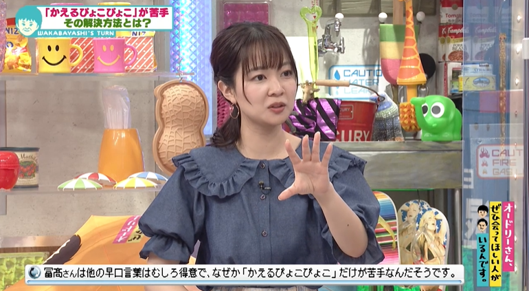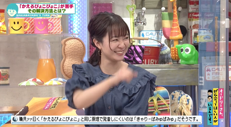 「かえるぴょこぴょこ」が上手く言えない冨髙さんに、磯貝アナは「前の音に引っ張られている」と指摘。「ぴょこぴょこ」をひとまとまりで考えず、「ぴょ」と「こ」で発音しなおすつもりで言うのがコツなのだとか。