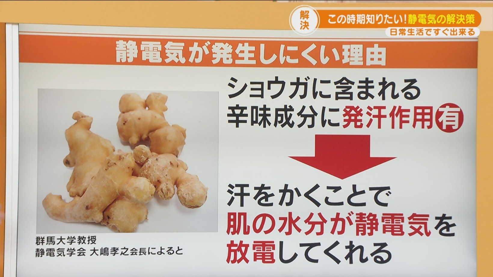実は「食事」にも静電気を防ぐポイントが!静電気学会会長の群馬大学・大嶋孝之教授によると、ショウガに含まれる辛味成分に発汗作用があり、汗をかくことで肌の水分が静電気を放電してくれるそうです。