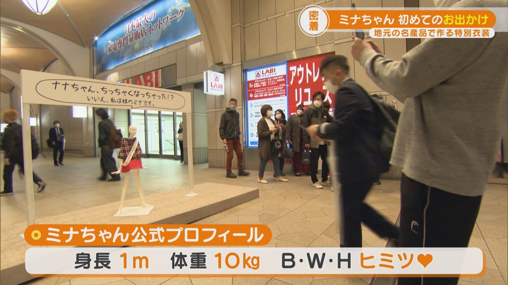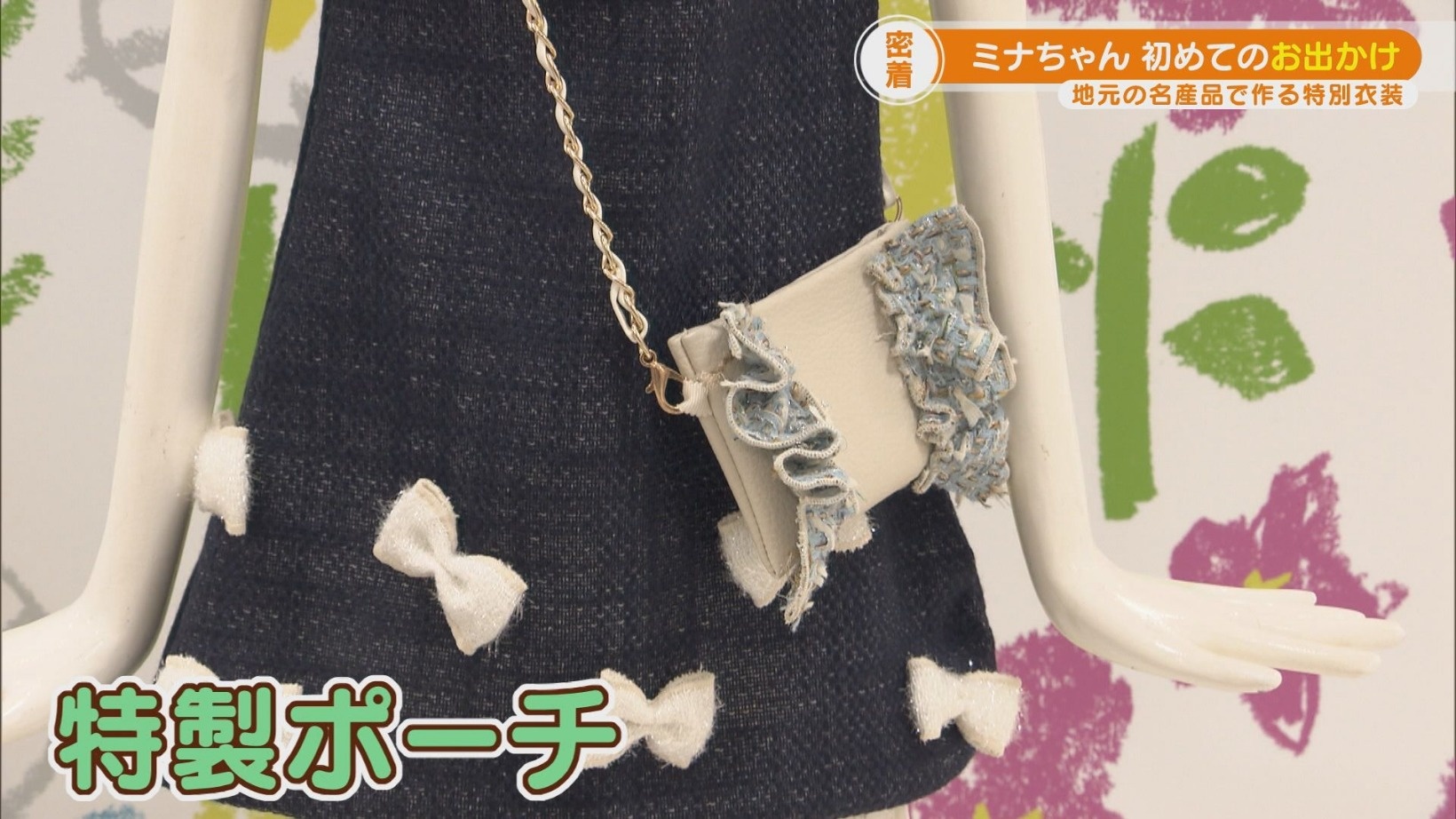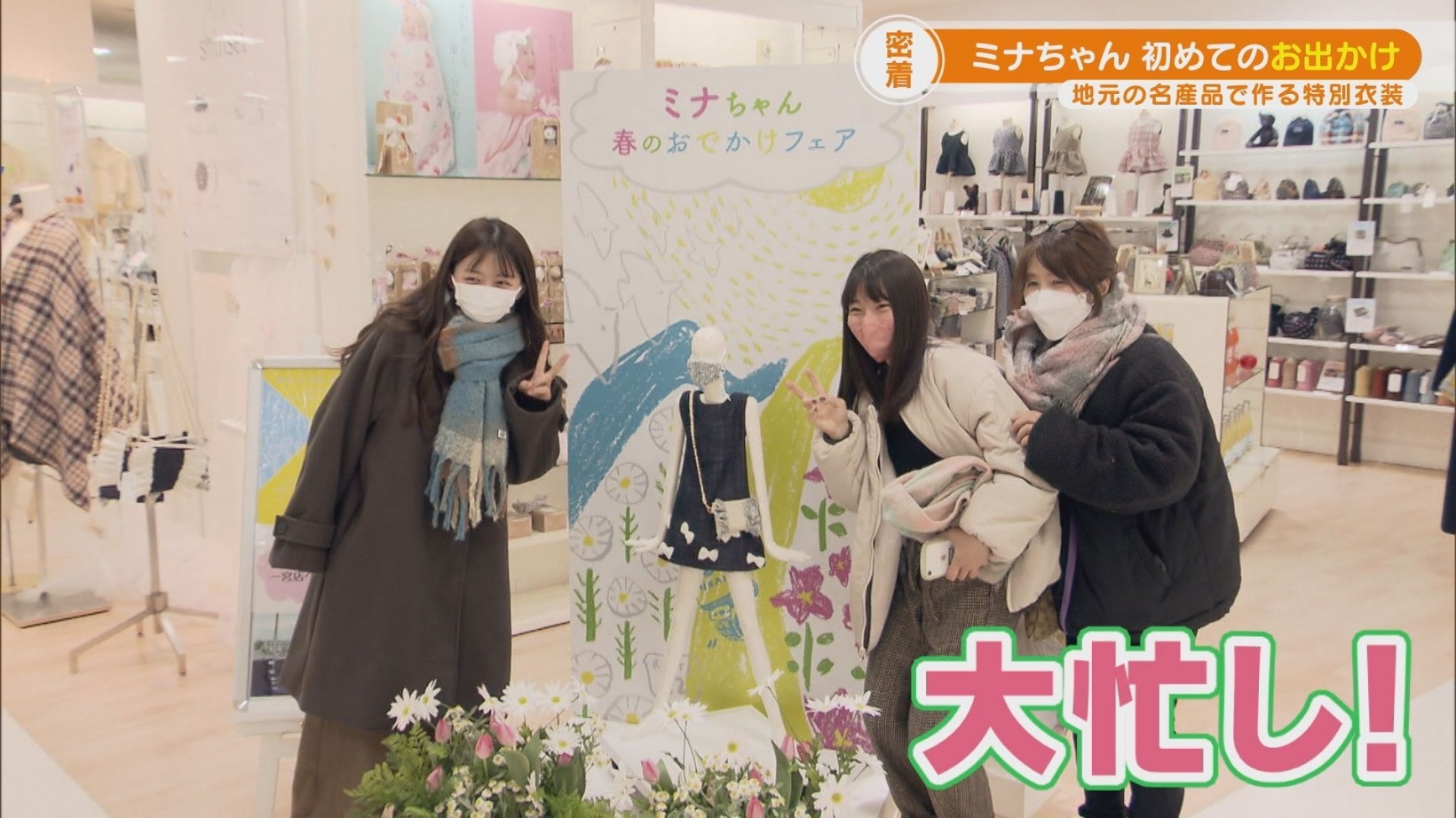 イベントの準備を進める名鉄百貨店一宮店に、ミナちゃんが到着。ミナちゃんの持ち場は、子供服売り場です。今回のお仕事は、フォトスポットでお客さんとの写真撮影!ワンピースには、かわいいリボンの飾りが散りばめられ、特製のショルダーバッグを肩にかけています!全て、地元の「尾州生地」でできています。