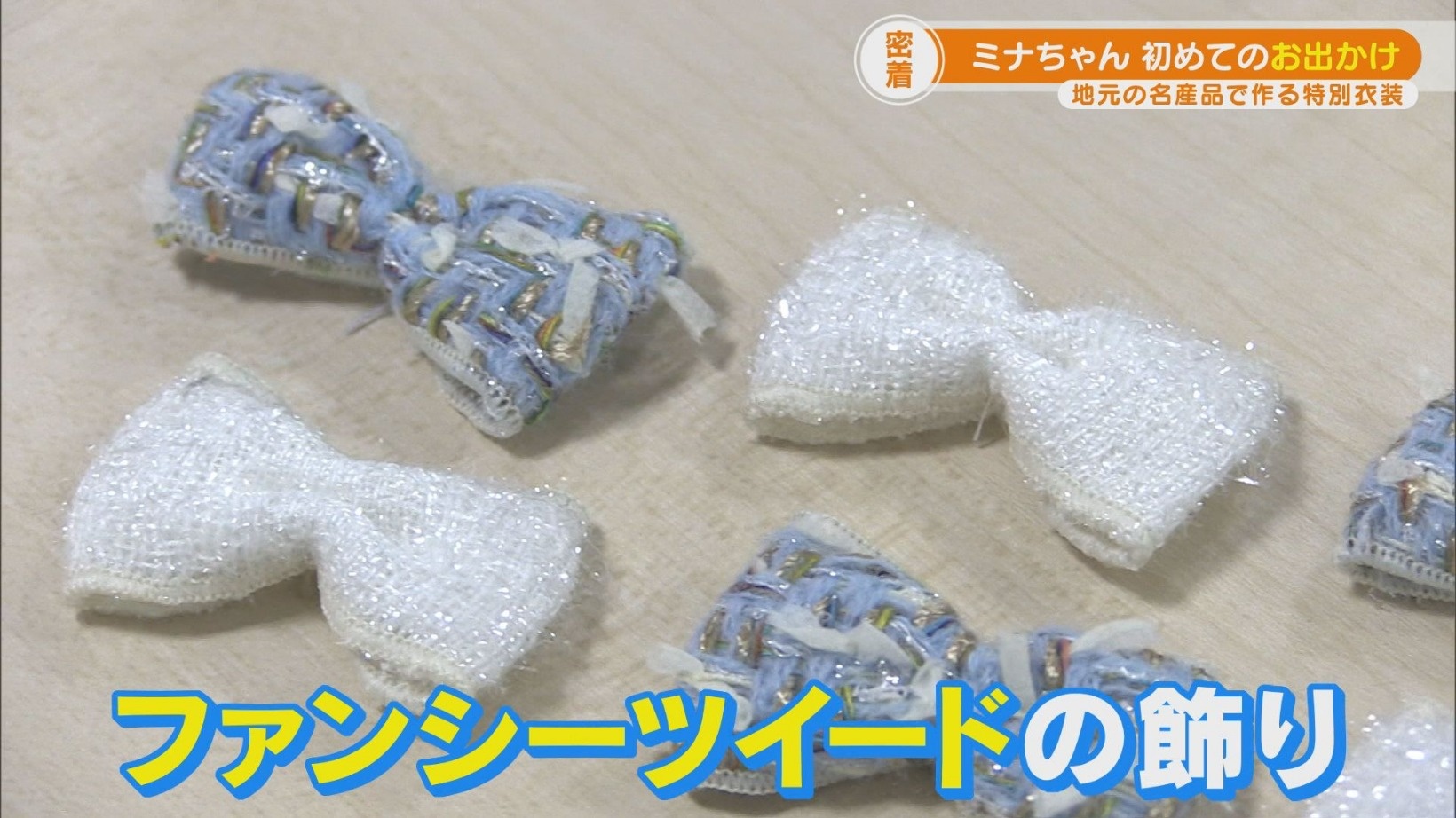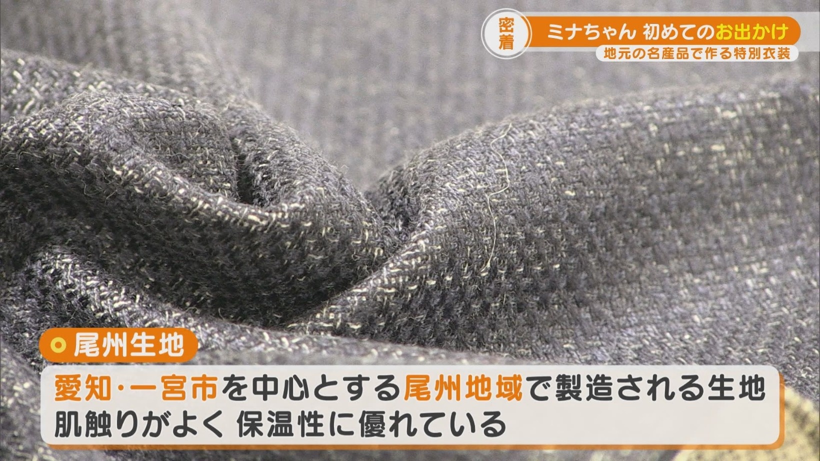 初めての外出ということもあり、ミナちゃんの衣装も、いつも以上に気合が入りました。デザイナーにオーダーメイドの衣装を発注し、衣装もこだわりの「尾州生地」を。一宮市を中心とする尾州地域で古くから製造され、肌触りや保温性に優れています。こだわりは生地だけではなく、デザインにも!