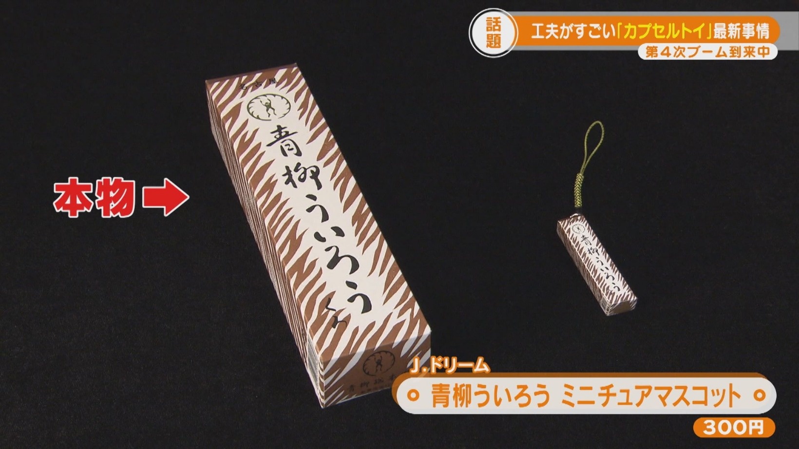 そして現在は第4次ブーム。名産品など地域ゆかりの商品がヒットしています。特に人気なのは、企業コラボによるリアルで精巧なミニチュア。名古屋市のういろう店「青柳総本家」が店頭などで販売して大人気となった「青柳ういろう ミニチュアマスコット」(J.ドリーム)もその一つ。本物のデザインが忠実に再現された青柳ういろうのストラップ。中身のういろうもパッケージ裏面の小さな文字もそっくりです。並べて写真を撮りたいと、一緒にういろうも買っていく方が多いそうです。