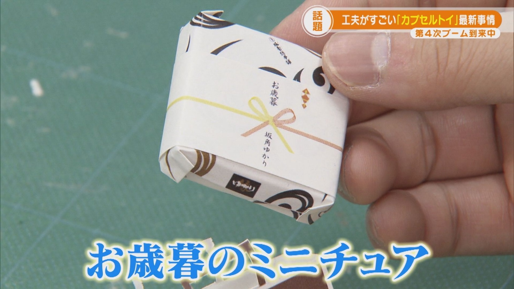各地の伝統銘菓の「銘菓ミニチュアコレクション」シリーズ(ケンエレファント)も人気です。東海地方からは、「坂角総本舗」の「海老せんべい ゆかり」がラインナップされています。実はこのミニチュアは、買って飾るだけでは終わりません。発売した後に、坂角総本舗はツイッターで、カプセルトイ用の包装紙やのし、紙袋が作れる画像データを公開!A4サイズにプリントして包むと、お歳暮のミニチュアを作れます。