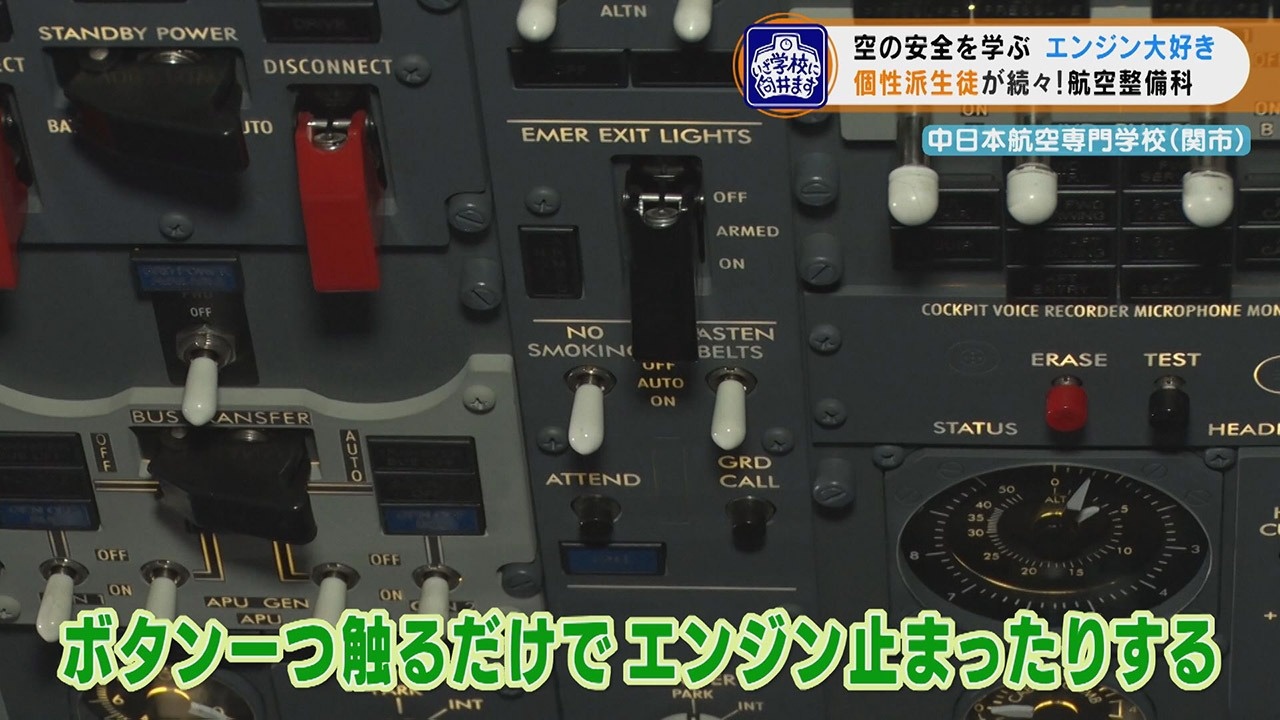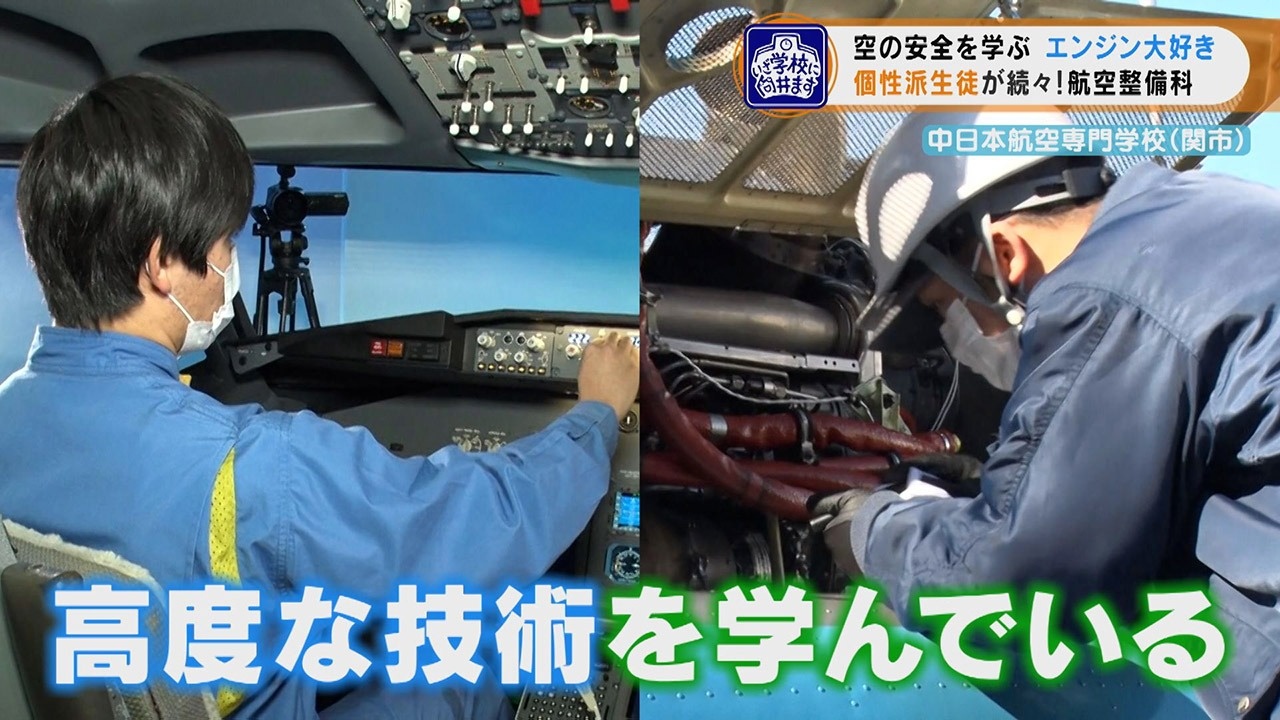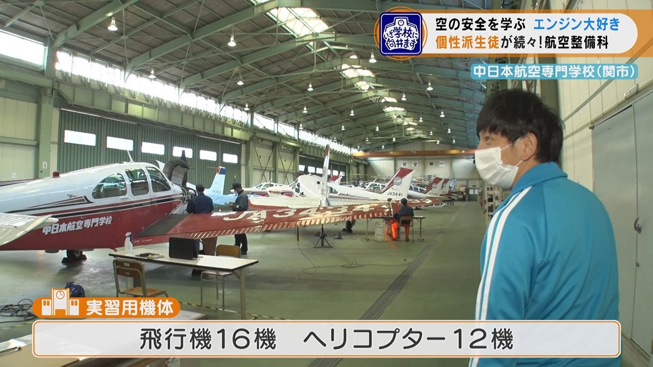 岐阜県関市にある『中日本航空専門学校』には、航空整備科、航空生産科、エアポートサービス科があり、本物の飛行機や空港で使用する設備などを使い、実践的なノウハウが学べます。今回は、3つの学科の中でも、6つのコースに分かれてより専門的な整備の知識と技術を学ぶ『航空整備科』に向井くんは向かいました。