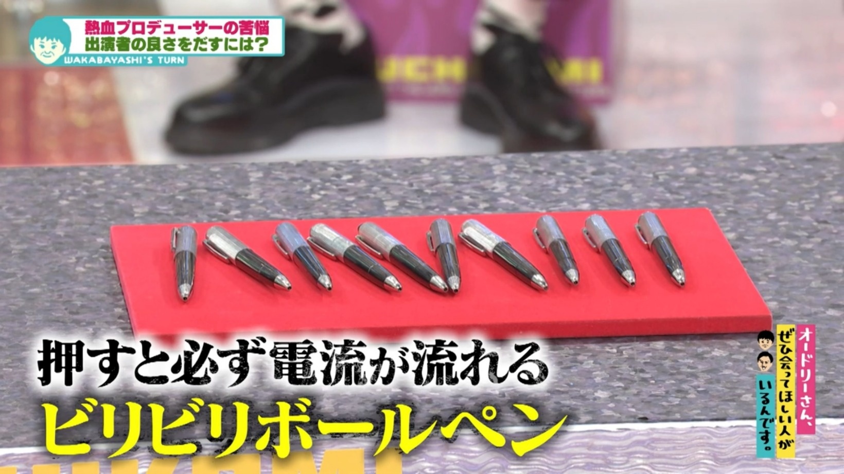 若林からの不満が明かされた直後、番組スタッフの「前田か若林がやればおもしろくなりそう」という浅はかな考えにより、押すと電流が流れるビリビリボールペンが登場。