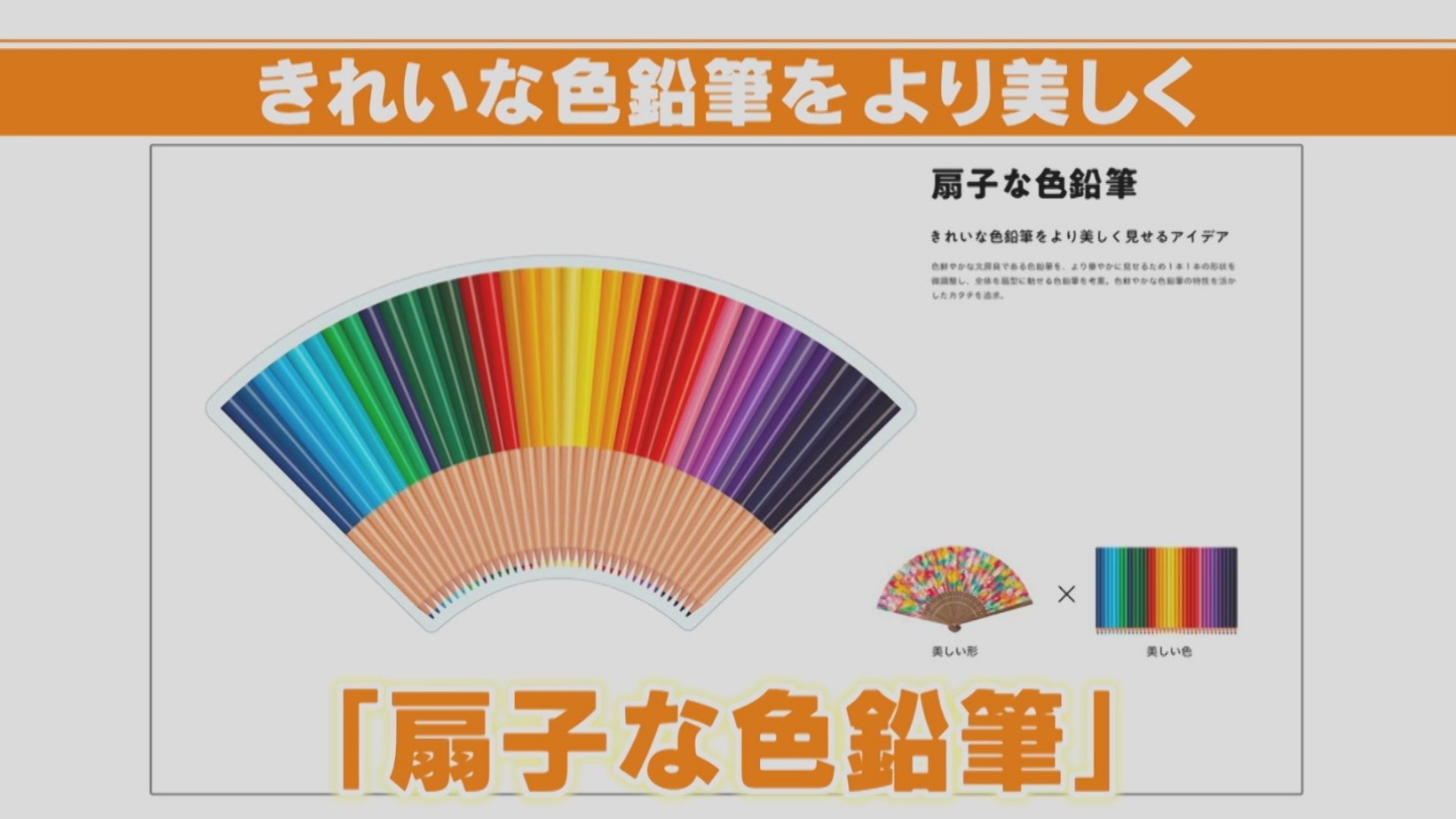 「扇子な色鉛筆」は、色鉛筆のしまい方を工夫。形状を変え、扇子のように見えるデザインにしました。きれいな色鉛筆をより美しく見せるアイデアです。