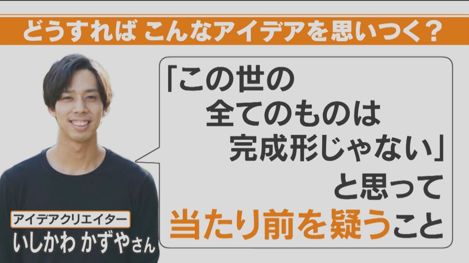 どうすれば面白いアイデアが思いつくのか、いしかわさんに聞いてみました。いしかわさんの答えは「この世の全てのものは完成形ではないと思って、当たり前を疑うこと」。アイデアは日常の当たり前に疑問を持つことから生まれているようです。