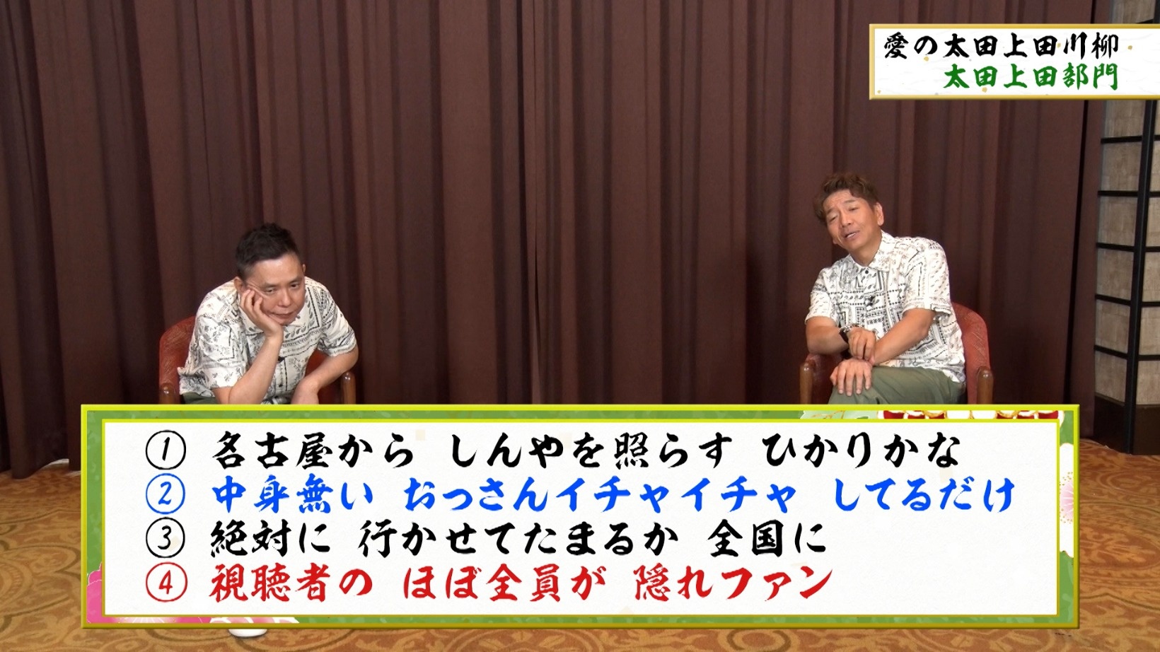 「太田上田部門」の最後の一句は、「視聴者の ほぼ全員が 隠れファン」。
