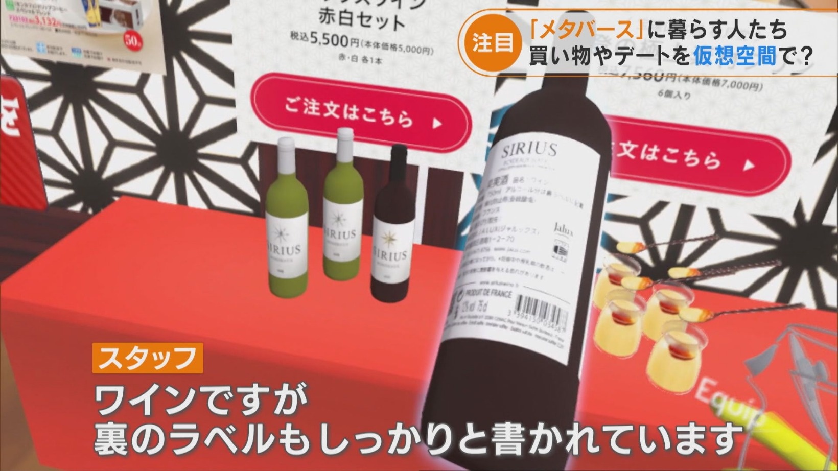 仮想空間上に作られたリアルな渋谷センター街を歩いていると、リアルではあり得ない位置に大丸松坂屋が現れます。店内に入ると、食品やデザートなど商品がズラリ。試しにワインを手に取ってみると、裏のラベルまでしっかりと書かれていました。気に入った商品は、ウェブサイトを通じて購入することができます。