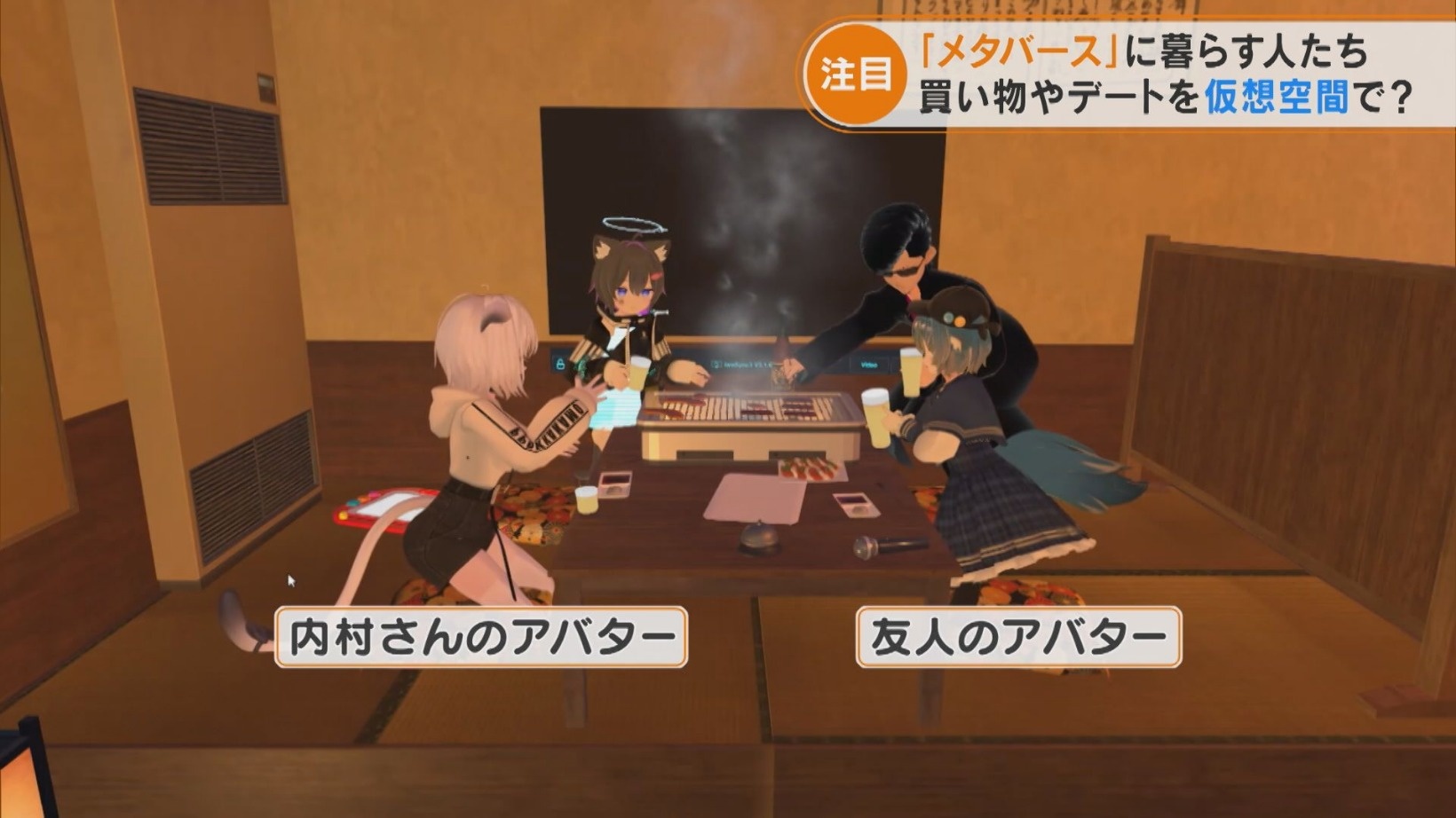 午後7時過ぎ、夕食の時間に内村さんは冷蔵庫からお酒を取り出しました。現実では友人と2人でただ食卓を囲んでいるだけですが、メタバースの中では4人の友人と、本当に焼肉を食べているかのように、盛り上がっています。