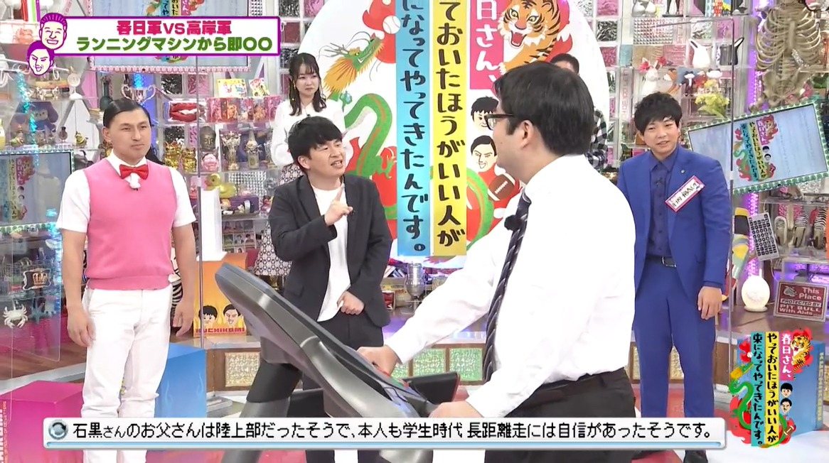 2021年12月30日放送の年末SPでは、前回に引き続きオードリー・春日軍vsティモンディ・高岸軍の対決が繰り広げられた。続いての種目「ランニングマシンから即〇〇」では、ぜひらー・石黒雄三さんの挑戦に対して、スタジオ全員で応援する思わぬ展開となった。