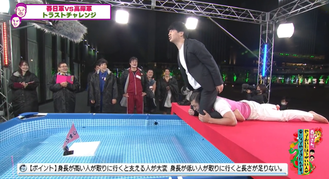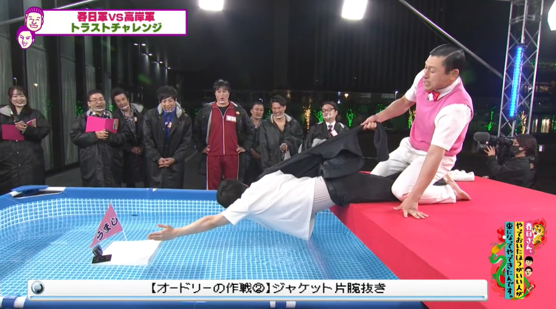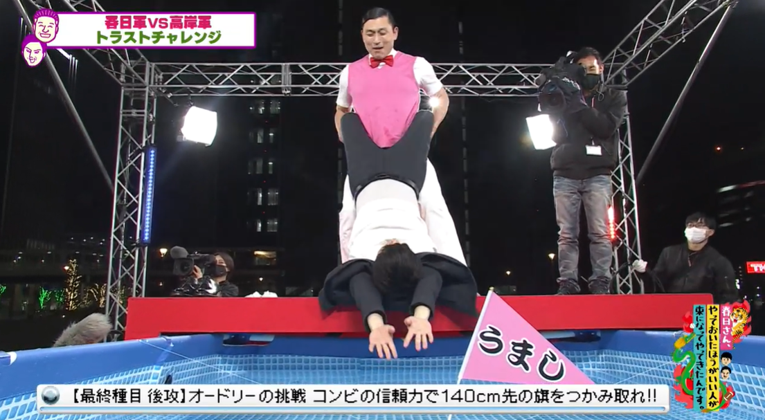 春日軍と高岸軍の対決もいよいよ大詰め。最終種目『トラストチャレンジ』では、先攻のティモンディが旗を取ったものの水に落ちてしまい、結果は失敗に終わった。後攻はオードリーの2人が挑戦することに。
