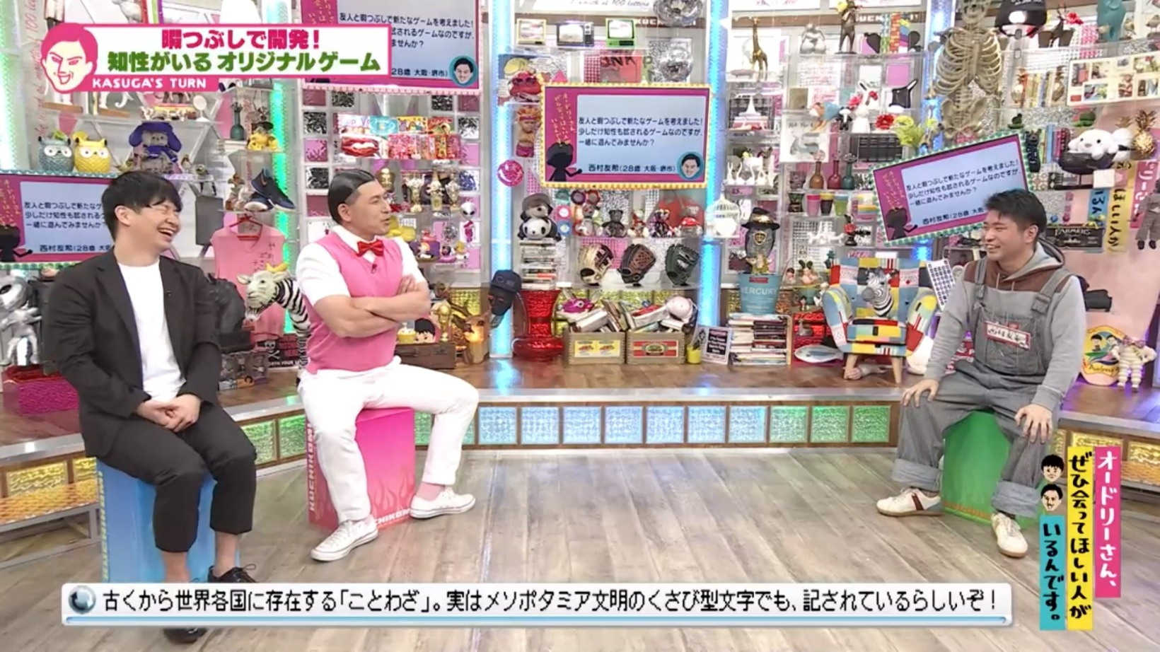 シンプルすぎる春日の案に、スタジオは大爆笑!「『お前何言ってんだ、それ深海にベンチプレスだな』というところで使う」と例文もあげた。「ことわざゲーム」で期待以上に盛り上がった4人なのであった。