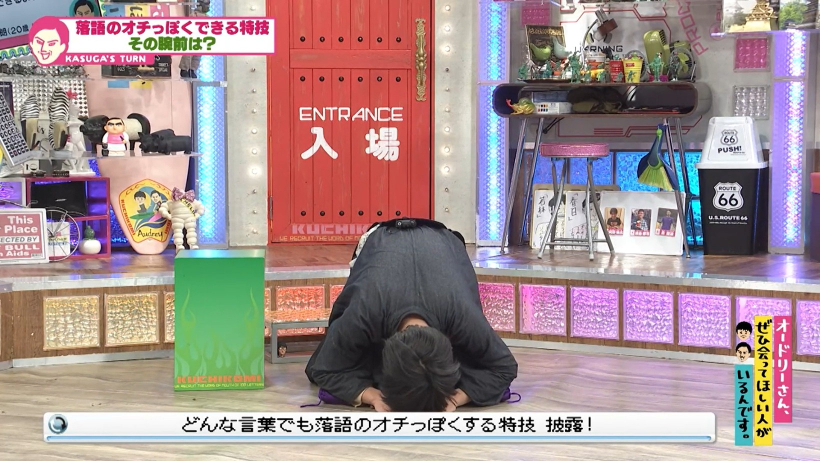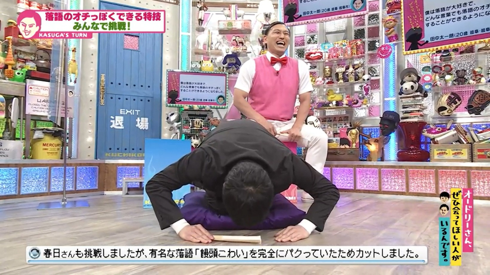 さっそく春日は、「オドぜひ」と言葉をリクエスト。田中さんは座布団に正座して数秒考えはじめた。