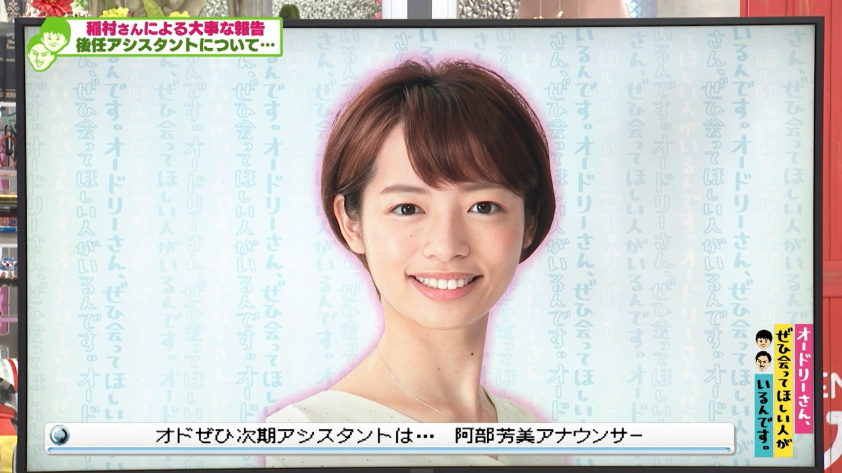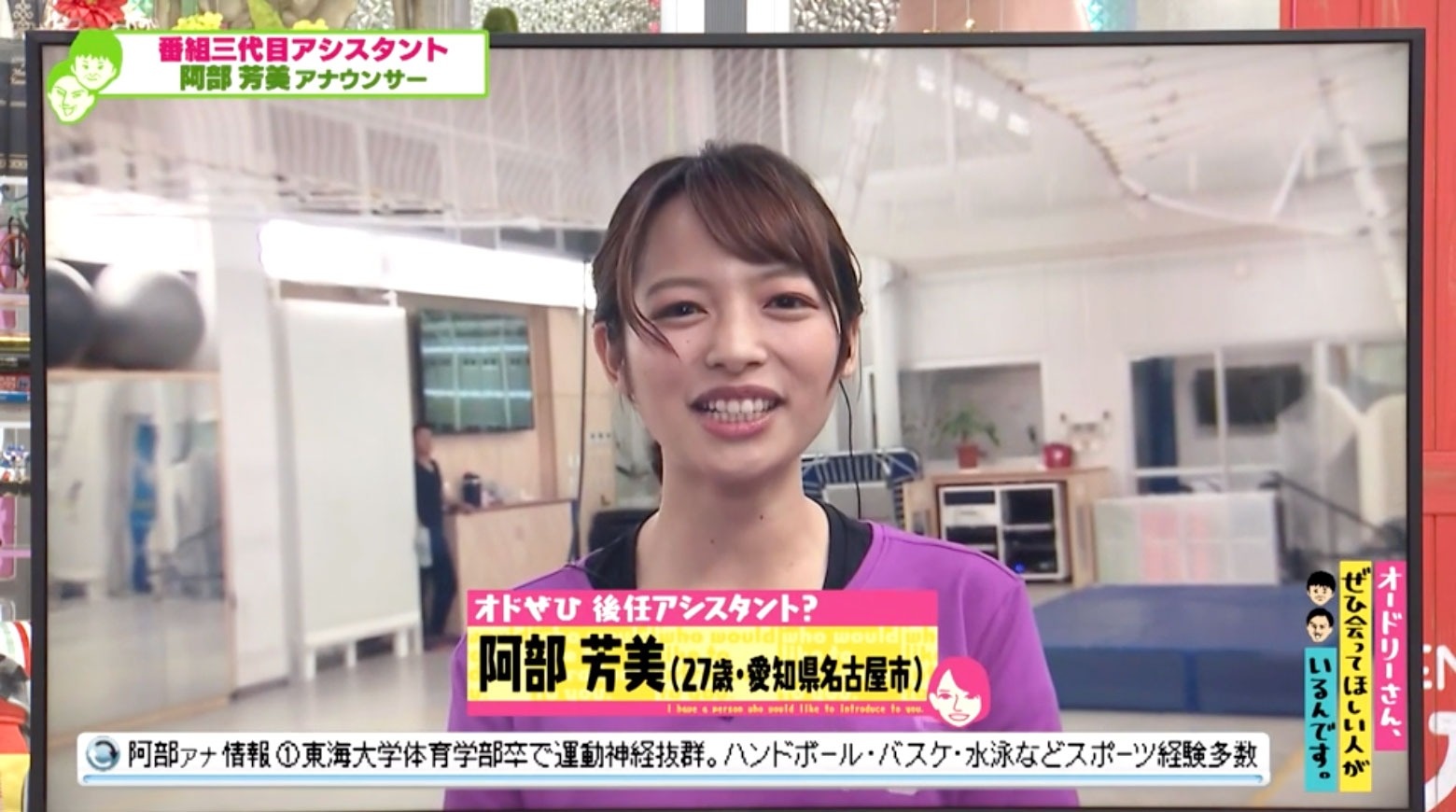 2022年4月18日の放送分では、『オドぜひ』を卒業する磯貝アナに代わるアシスタント候補の阿部芳美アナが登場!特技である空中ブランコの大技に成功すれば正式にアシスタントになれるというが…!?