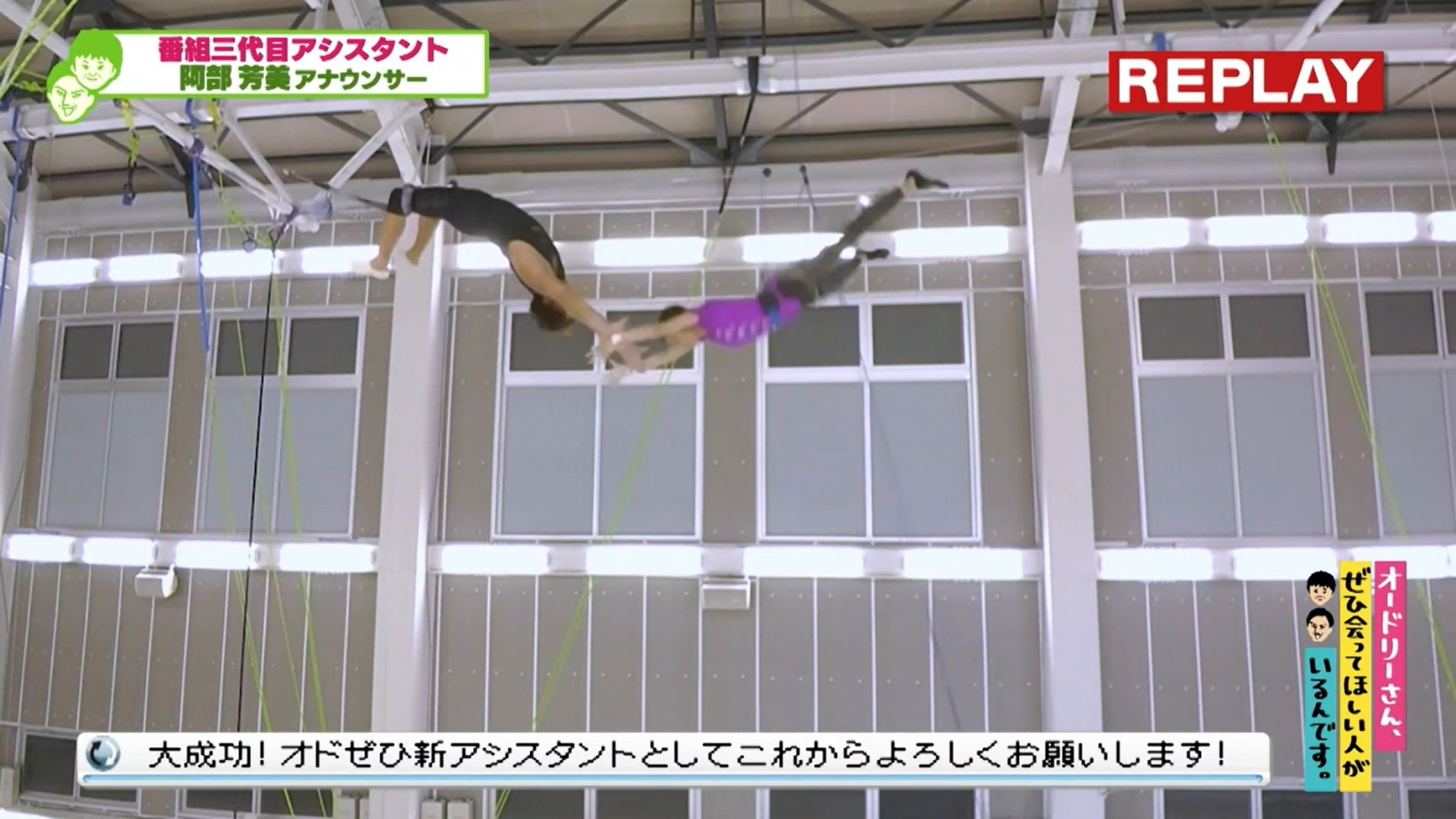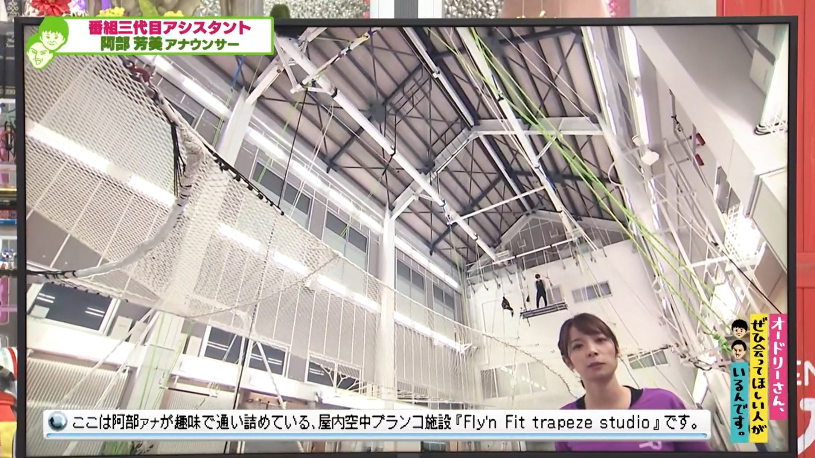 中継先は、趣味で3年通い詰めているという屋内空中ブランコ施設『Fly’n Fit trapeze studio』。今回阿部アナは、空中ブランコの大技に成功すれば正式に番組アシスタントになれることに。