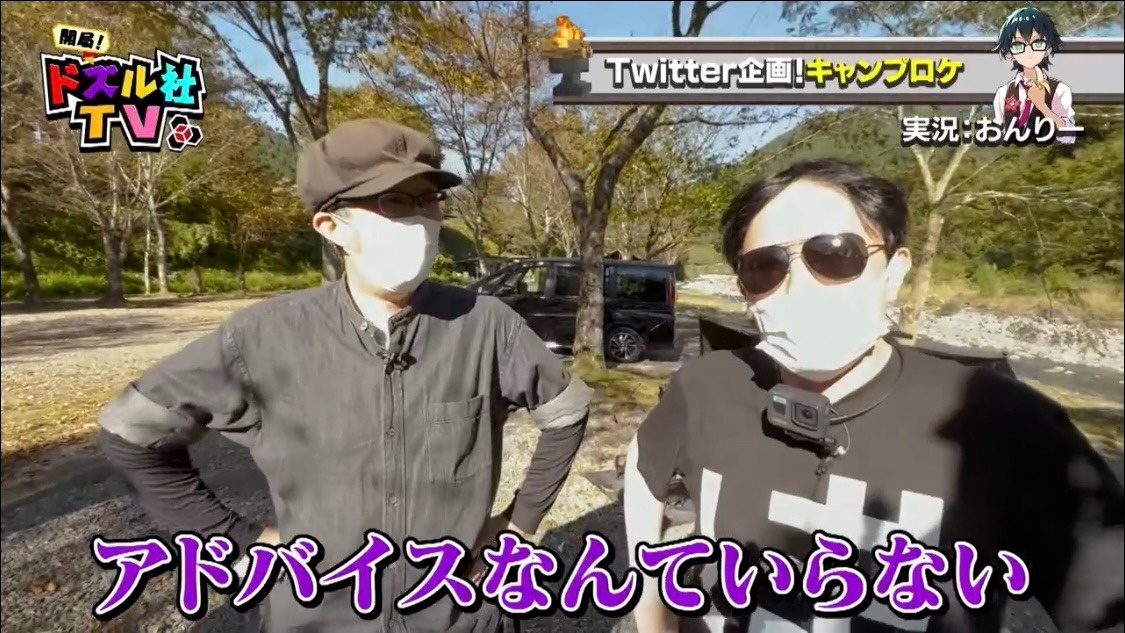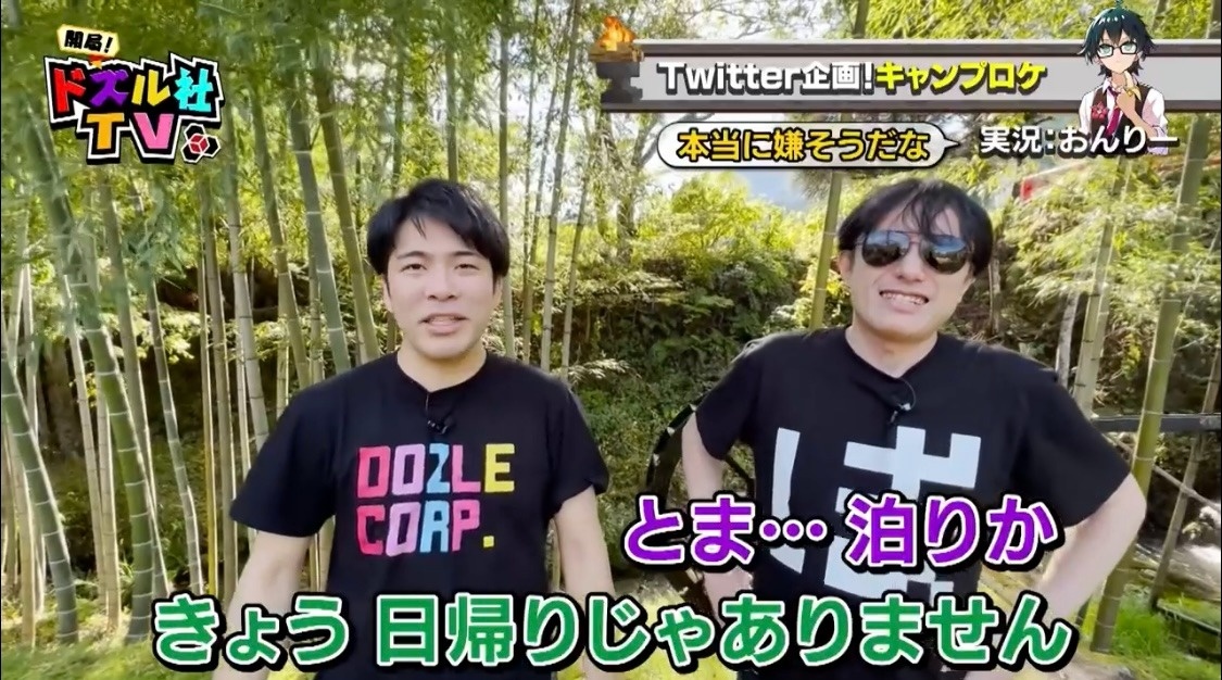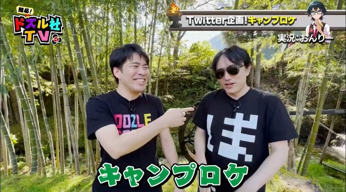 自然豊かな場所からスタートした6回目の『開局!ドズル社TV』。今回は、視聴者から多くのご要望をいただいたキャンプロケを実施することに。よっ!と盛り上げるドズルに対し、テンションが上がらない様子のぼんじゅうる。アウトドアに抵抗があるようです。