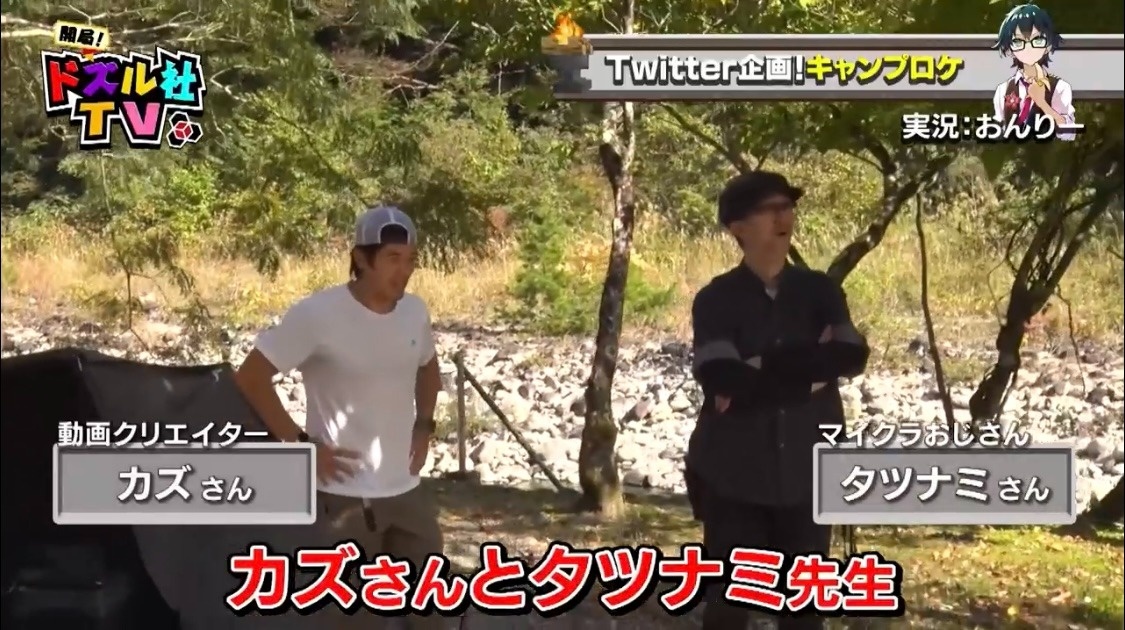 今回のロケではキャンプの達人が2人参加することに。そのゲストというのが...動画クリエイターのカズさんとマイクラおじさんことタツナミさんです。人気ゲーム実況YouTuber2人の登場に、ドズルは「すごい豪華ゲストですね」と興奮気味に話します。