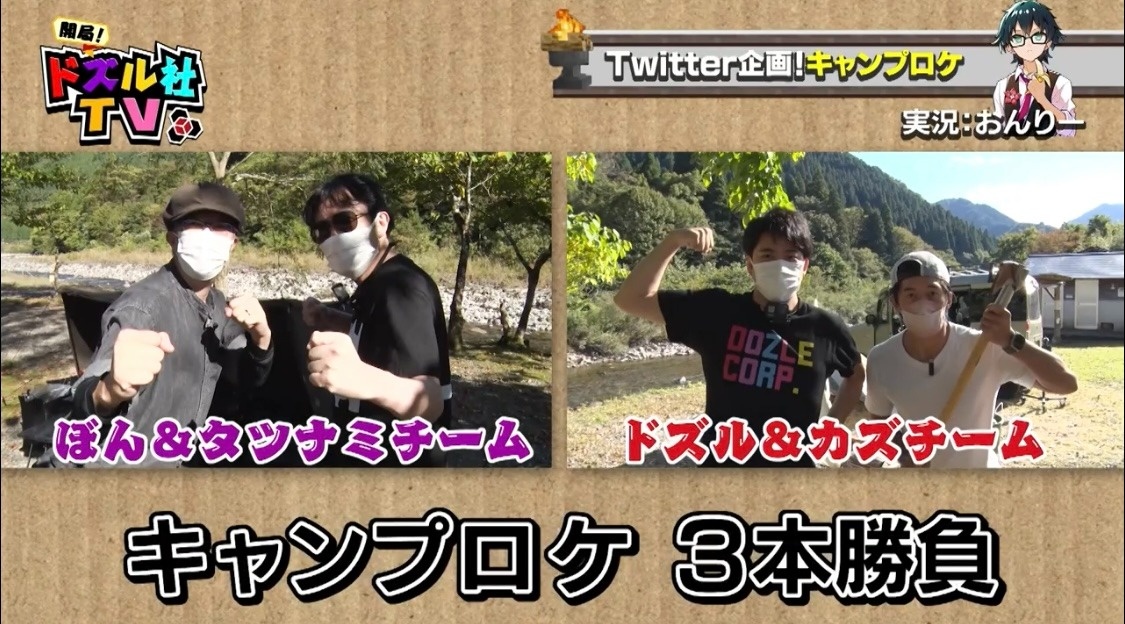 そして、キャンプロケの内容が「チーム対抗3本勝負」だと告げられます。ぼんじゅうる&タツナミチームと、ドズル&カズチームに分かれて戦うことになりました。