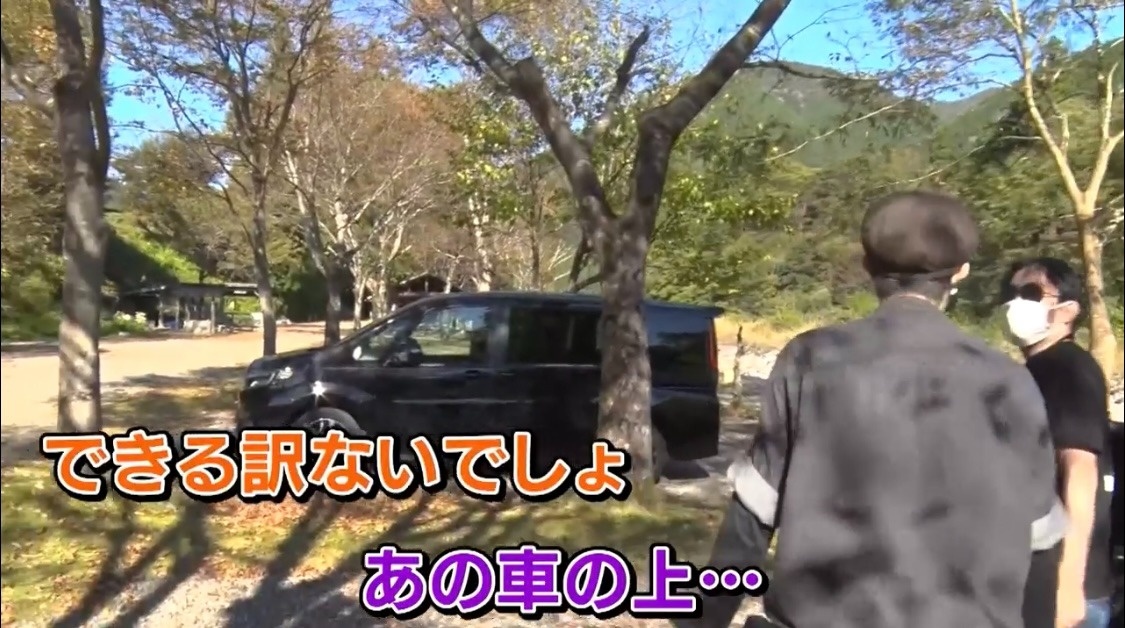 まずはぼんじゅうる&タツナミチーム。テントを張る場所について「できるだけ平らな所がいい」と話すタツナミさん。停まっていたワゴン車を指差して「あの車の上...」とボケるぼんじゅうるに、「できる訳ないでしょ!」とすかさずツッコみます。ある意味チームワークは良さそうです。
