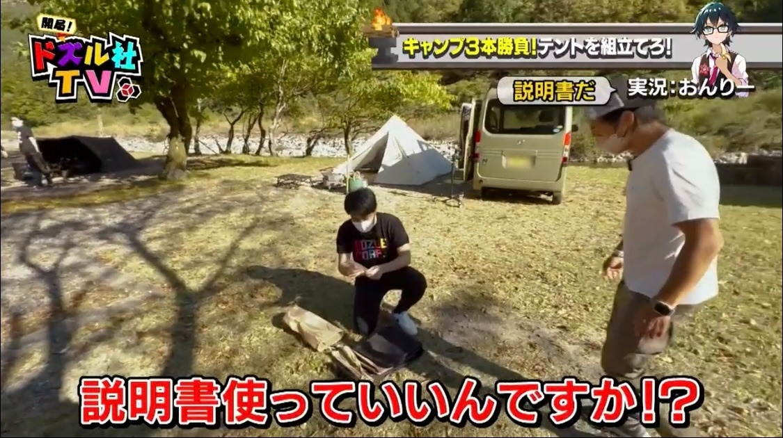 対してドズル&カズチームはすぐに場所が決まり、テントを袋から出し始めます。すると、説明書を発見するドズル。「説明書使っていいんですか!?」と尋ねますが、カズさんが何も言わず没収。それでも順調に作業を進めていきます。