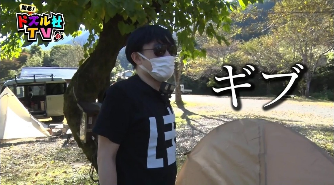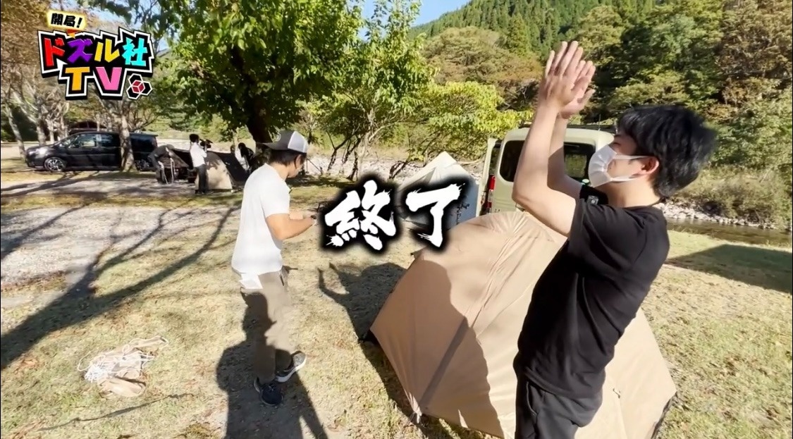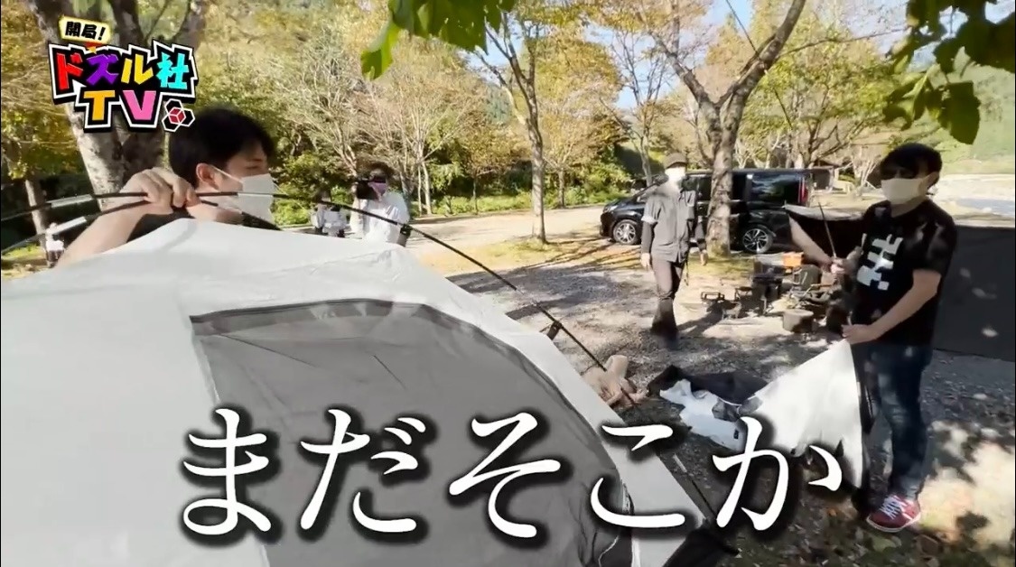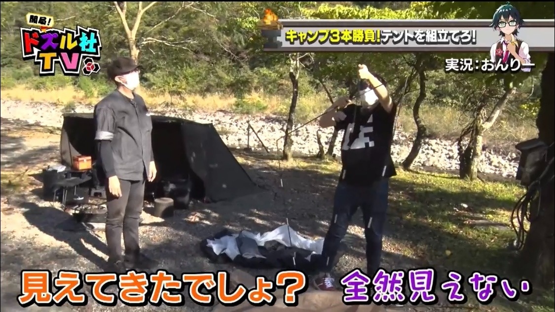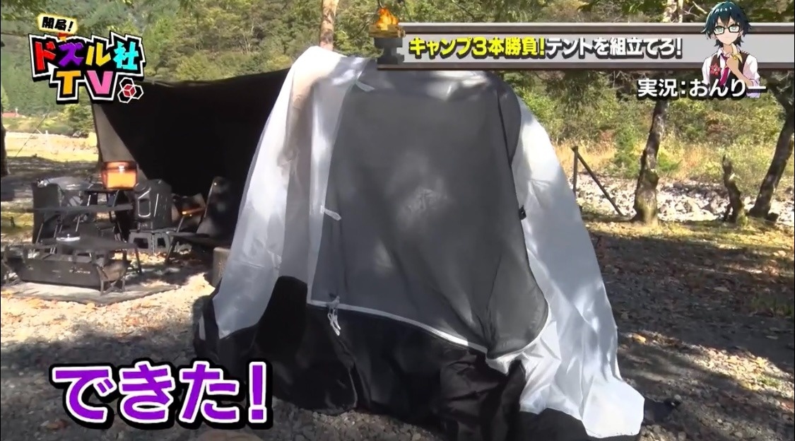 骨組みが完成したドズル。わざとぼんじゅうるのそばへテントを運び、「どんな感じですか?あ、まだそこか」と余裕を見せつけます。これには「何あれ、予習したろ」とぼんじゅうるの負け惜しみがとまりません。