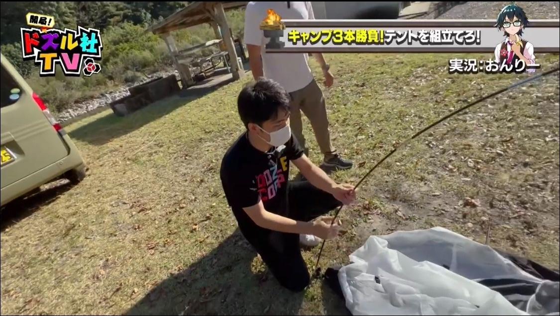 “ある方”から1本目の勝負内容が届いているとのこと。そのミッションを聞いてみると、声の主はドズル社TVメンバーのおんりー。「最初の勝負はテント組み立て対決です。ゲストの力を借りずにドズル・ぼんじゅうるに自力でテントを組み立ててもらいます。先に組み立てた方が勝ち」という勝負内容です。