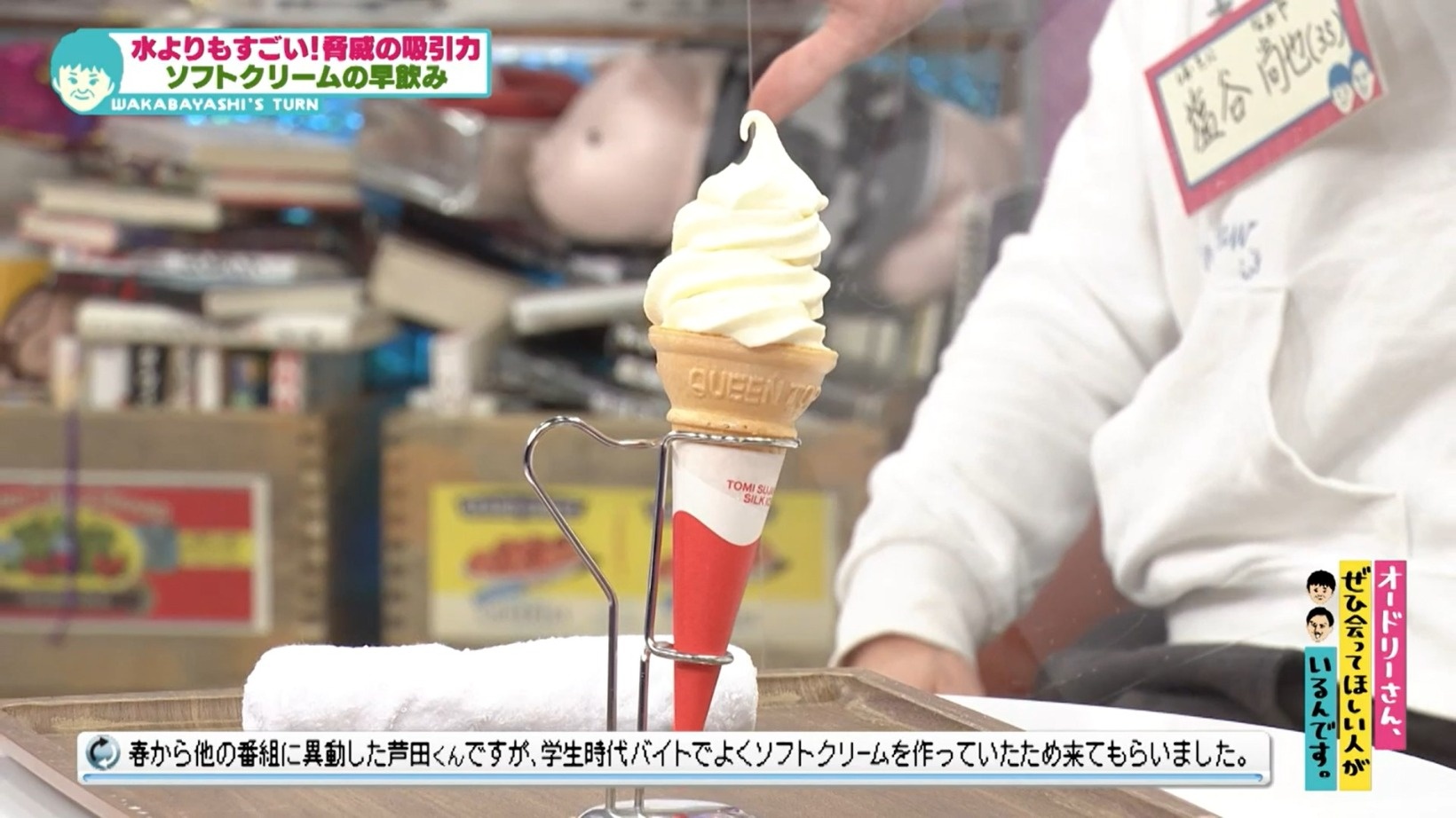 「押し込んだら入る」という岩本流の方法で、春日がソフトクリームの早飲みに挑戦。塩谷さんの号令で、ソフトクリームを勢いよく口に押し込んだ。