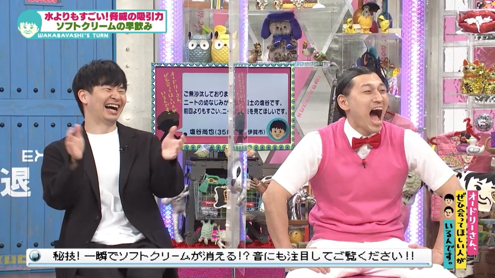 ここで岩本さんが「ソフトクリームの早飲み」を披露することに。塩谷さんが「レディーゴー!」と号令をかけると、岩本さんはソフトクリームを口へ押し込み、一気に飲み込んでみせた。一瞬の出来事にスタジオ大爆笑!
