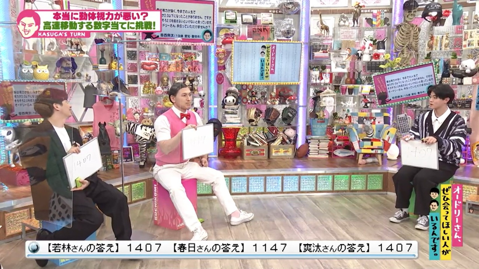 今回のゲームは、モニターに映る「高速で動く数字」を読み取って当てるというもの。オードリーと爽汰さんの3人で挑み、「オドぜひ動体視力王」を決める。